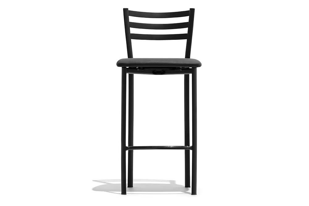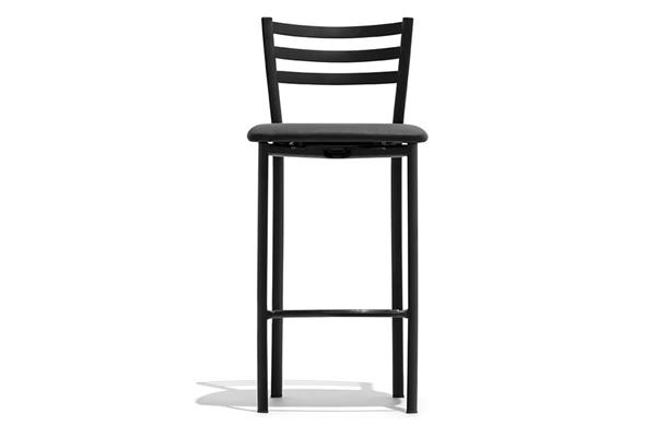 La struttura è disponibile nei colori Nero opaco e Acciaio satinato, mentre la seduta può essere imbottita o in legno di faggio multistrato.
