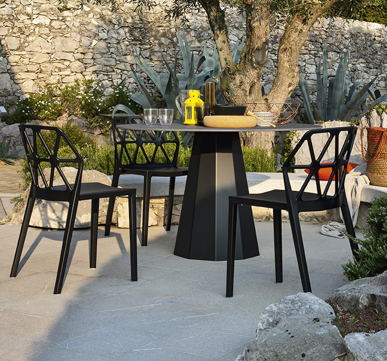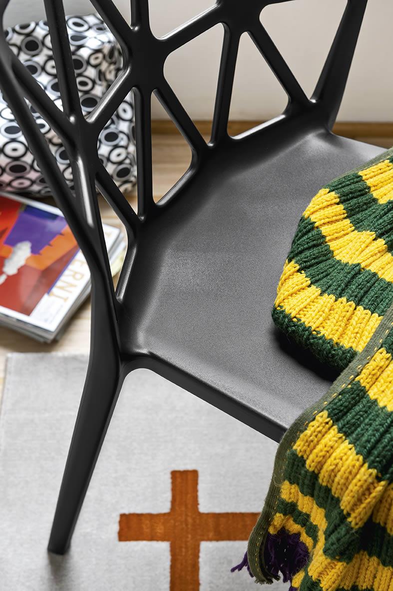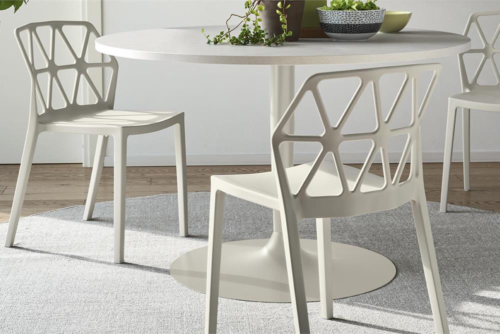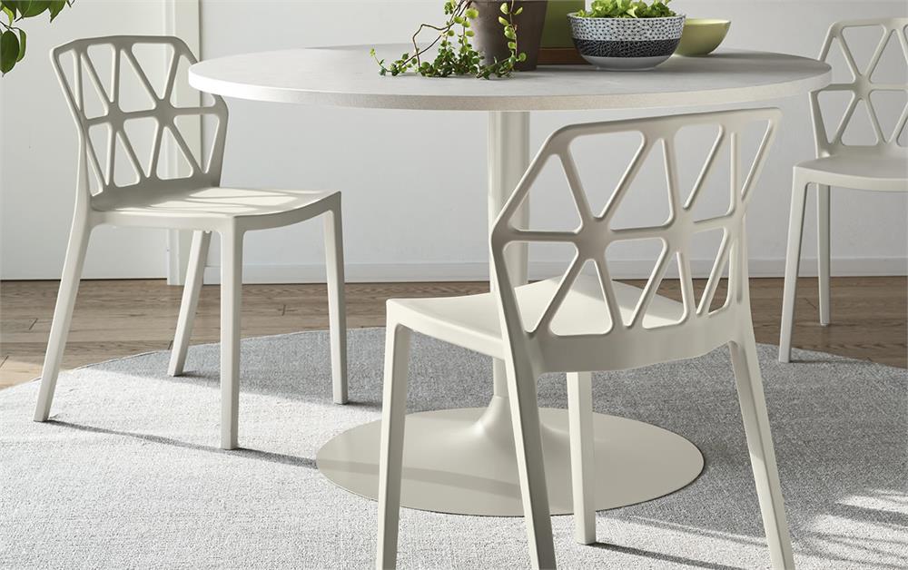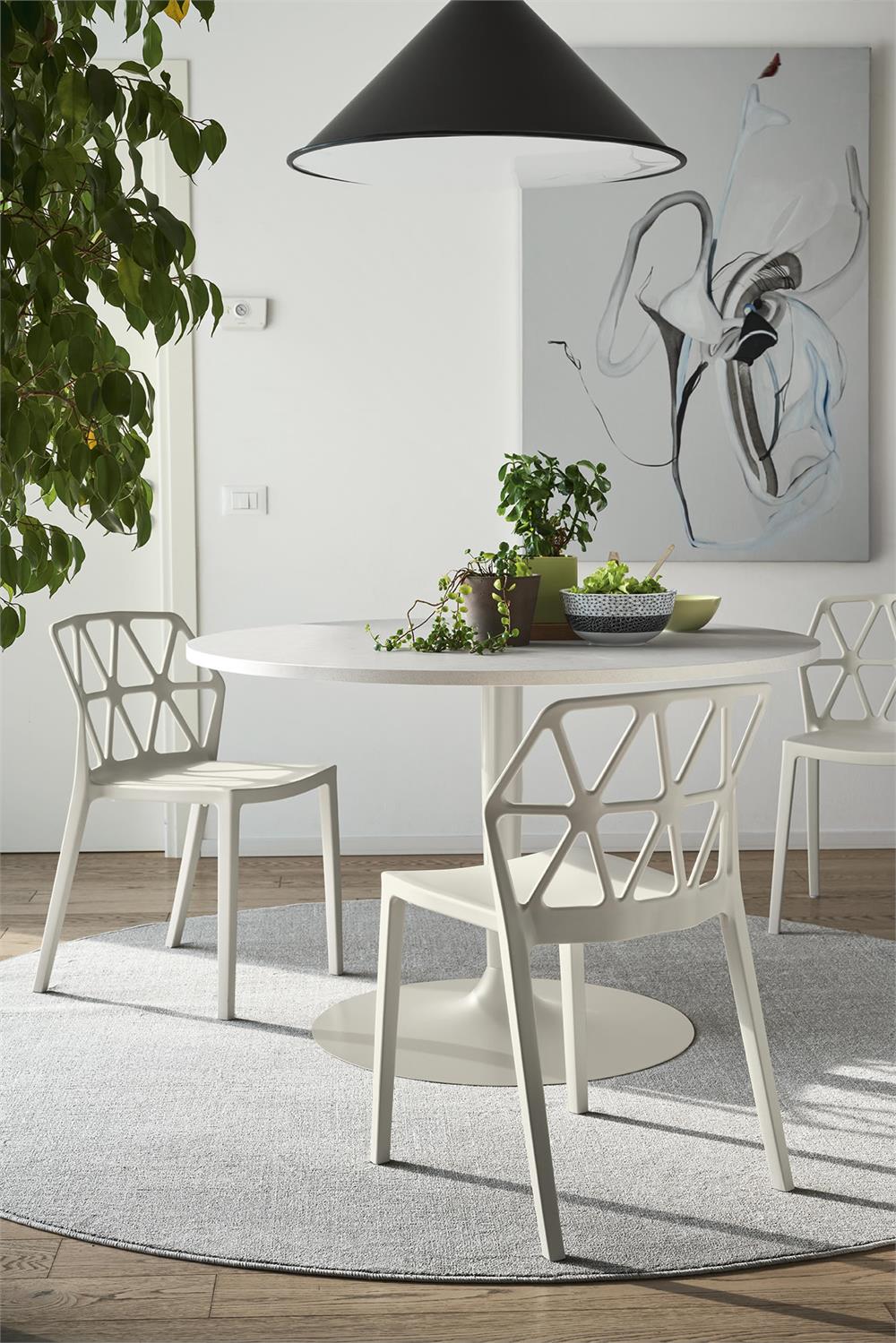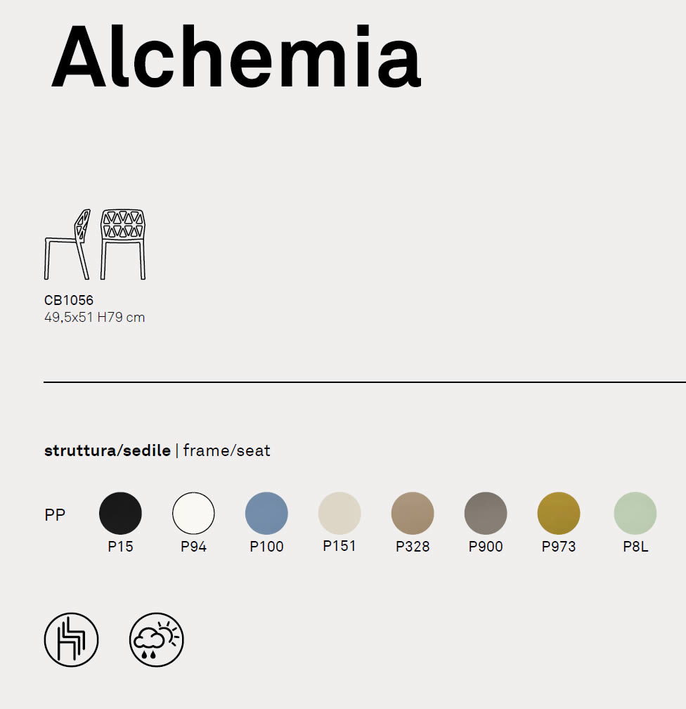 La sedia Alchemia, completamente realizzata in polipropilene, è disponibile nelle seguenti colorazioni: timo opaco, nero opaco, bianco ottico opaco, sky blue opaco, canapa opaco, nocciola opaco, tortora opaco, senape opaco.
