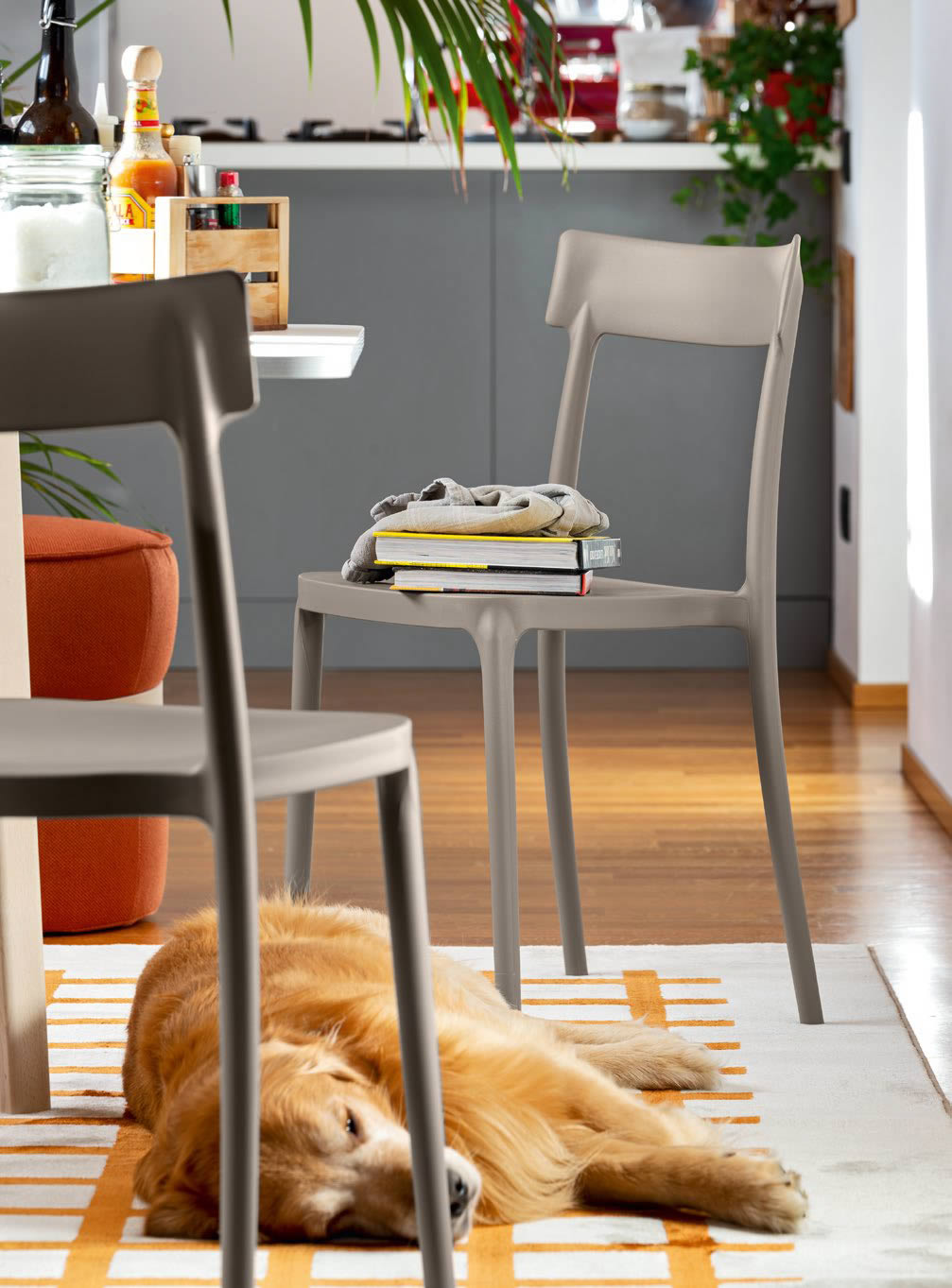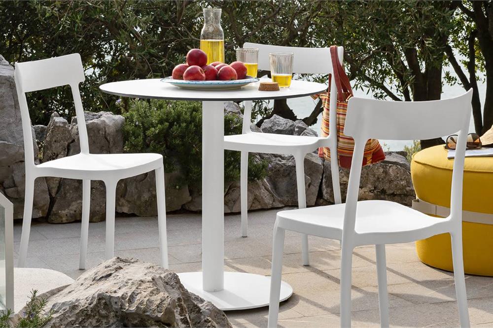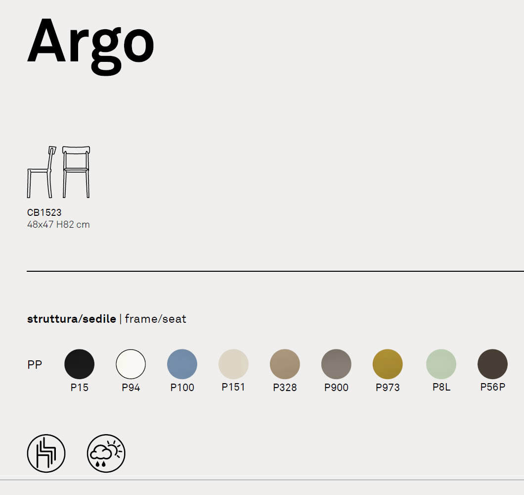 La sedia ARGO, realizzata interamente in polipropilene, impilabile fino ad un massimo di 4, è adatta anche per l'uso esterno.