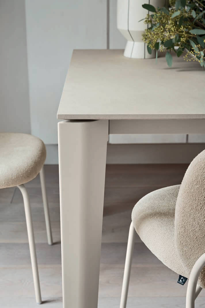 Tavolo rettangolare allungabile con piano in nobilitato e gambe in metallo.