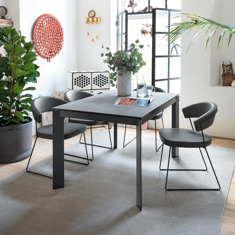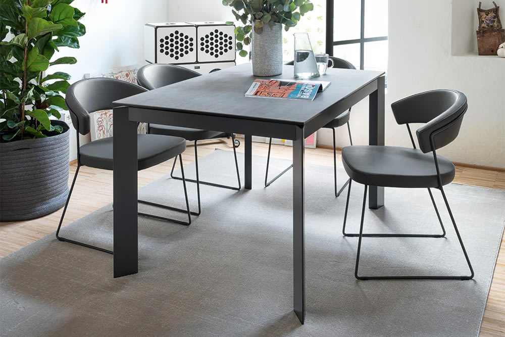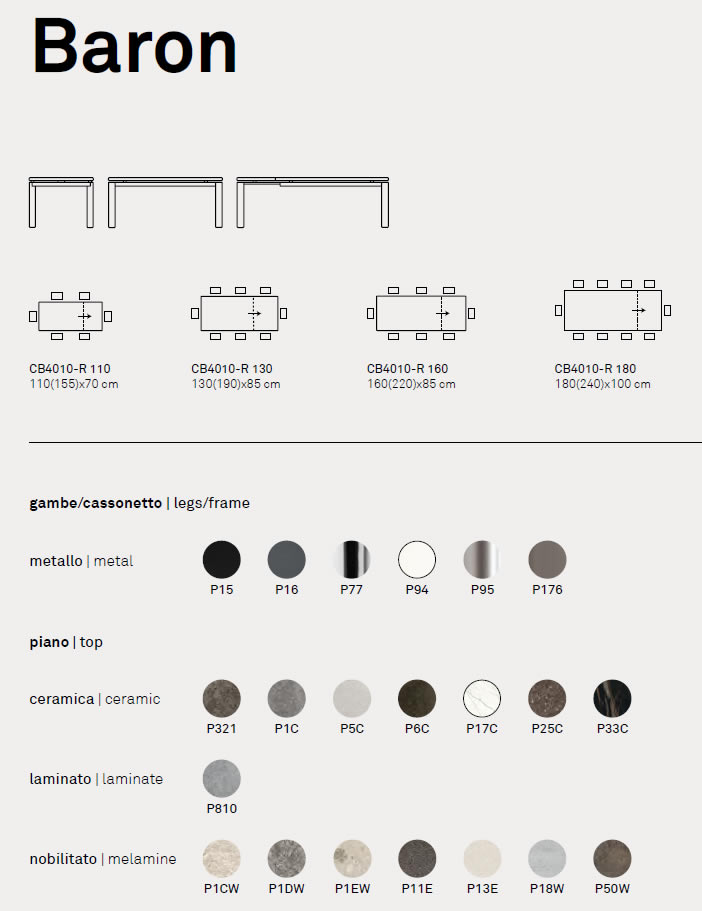 Il tavolo BARON racchiude al suo interno un pratico meccanismo in grado di aumentare la superficie d'appoggio. Tirando verso di sé la struttura, le due gambe dotate di ruote nascoste scorrono da un lato permettendo di estrarre l'allunga. Con un semplice movimento a rotazione l'allunga montata su binari in metallo esce dal suo alloggiamento e si allinea al piano. Le gambe di forma triangolare restano sempre perimetrali garantendo il massimo comfort a tutti gli ospiti