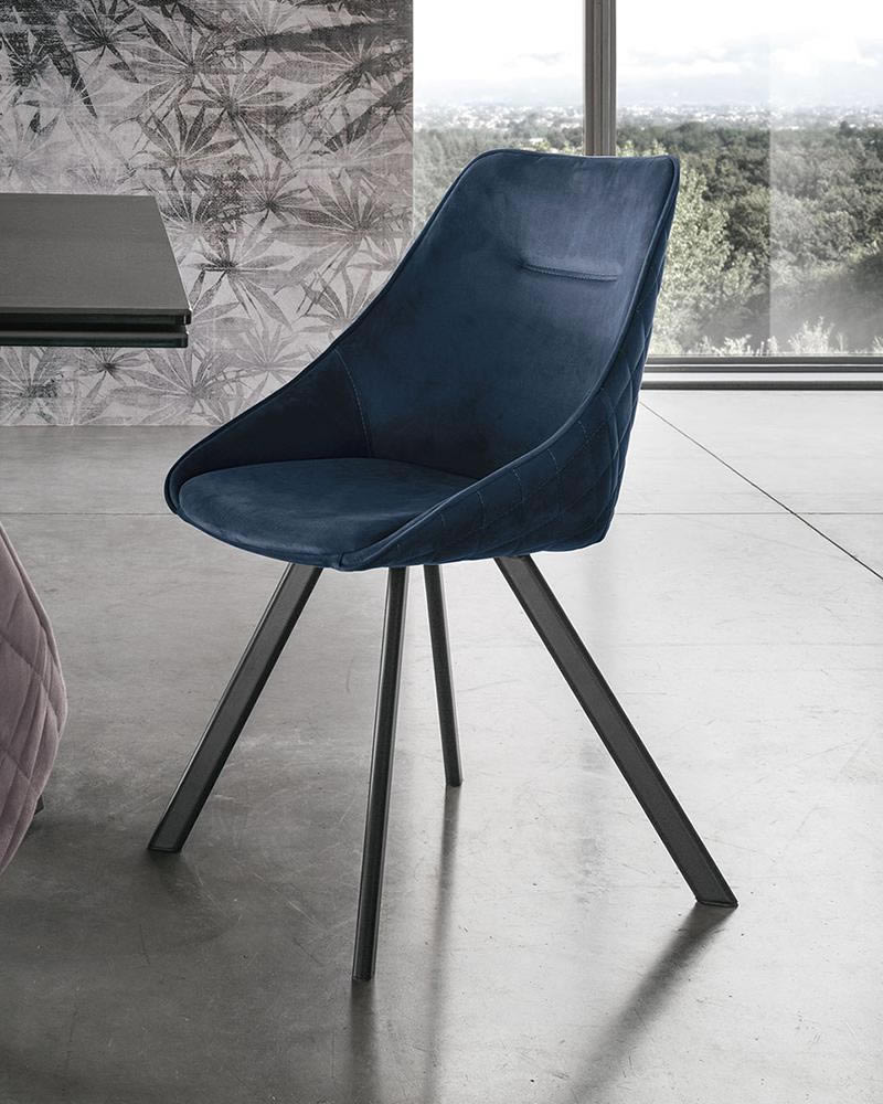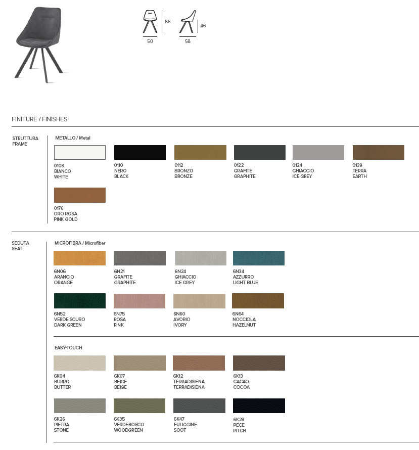 Sedia imbottita e rivestita in morbido Easy-Touch o microfibra con struttura in metallo verniciato. Disponibile anche con seduta girevole.