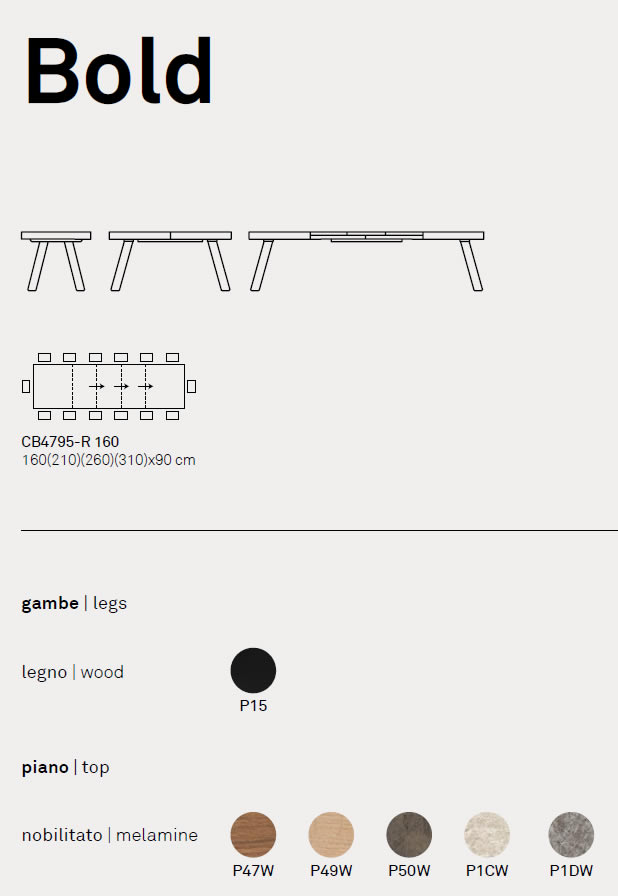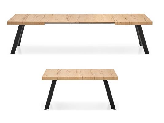 Tavolo allungabile con gambe colore nero in legno di faggio e piano in nobilitato. Il sistema di allunga centrale prevede che le gambe ed il cassonetto si divarichino, rendendo accessibile il cassetto interno che alloggia tre allunghe indipendenti. Le stesse consentono di allungare, a piacimento, il tavolo in tre diverse lunghezze a seconda dell'esigenza. Le guide in alluminio garantiscono un'ottima stabilità.