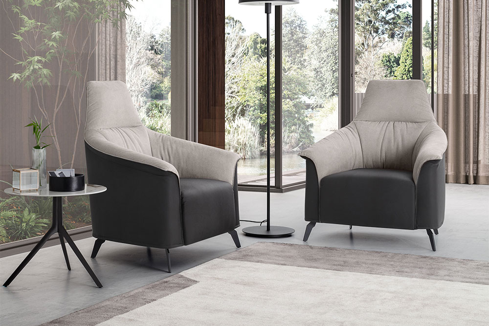 Schienale disponibile in versione alta e bassa, scocca disponibile mono o bicolore con rivestimento in tessuto, texil o vera pelle.