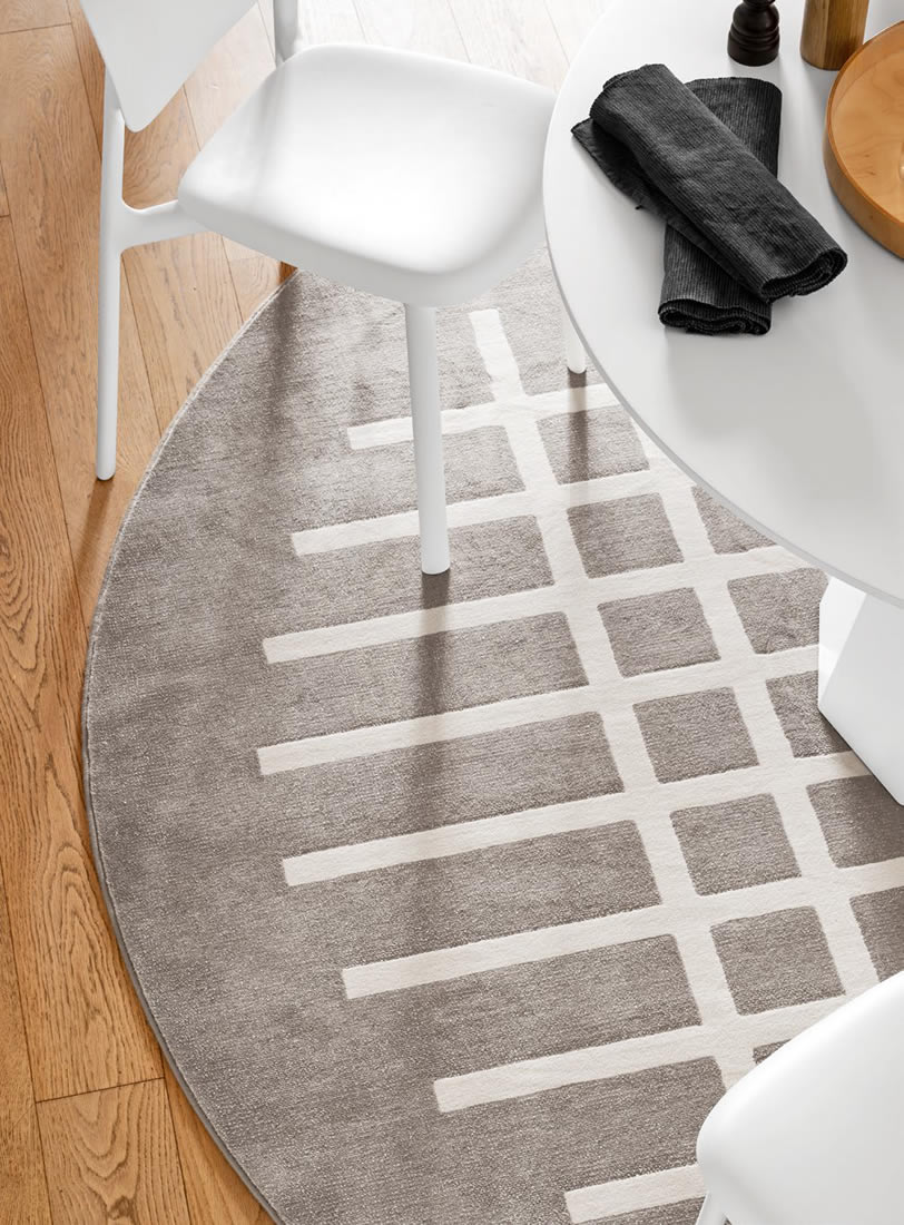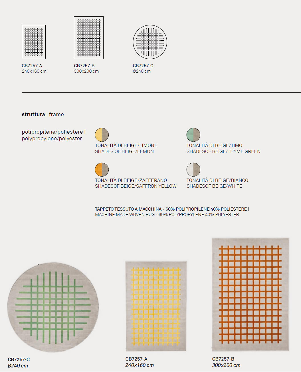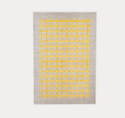 Nasce dal piacevole ricordo di un quaderno a quadretti della scuola. Una maglia di linee semplici crea un tartan ortogonale con un piacevole effetto visivo che disegna la stanza. Morbido al calpestio è perfetto sotto un tavolo o di fronte al divano. Tappeto tessuto a macchina in polipropilene/poliestere con base beige e diverse tonalità di decoro (Limone, Timo, Zafferano e Bianco).