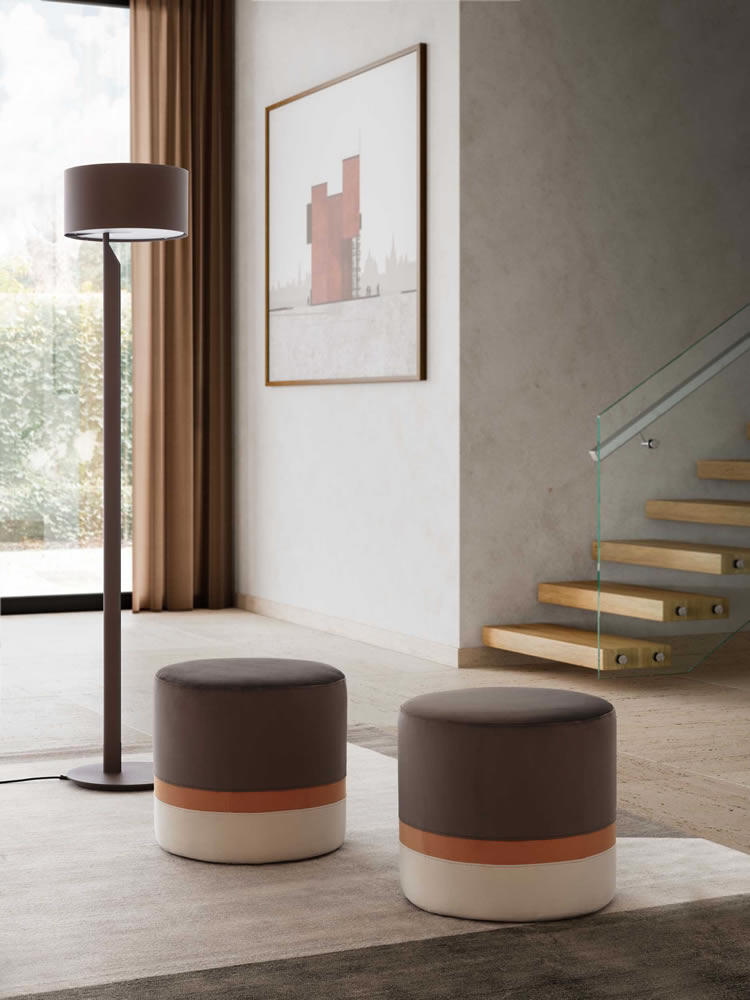 Pouf rotondo, completamente sfoderabile, con rivestimento suddiviso in fasce tricolore.