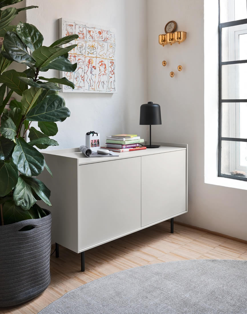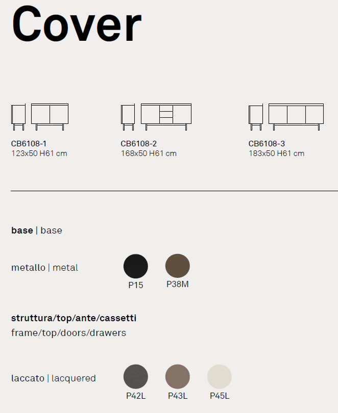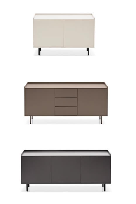 Famiglia di madie Cover, perfette per dare un tocco di stile alla vostra casa. Disponibili in tre misure diverse, queste madie sono dotate di ripiani interni in vetro per offrire organizzazione e leggerezza. Il basamento in metallo conferisce resistenza e linearità, mentre i piani e le ante sono ricoperti da un delicato laccato opaco che dona un tocco di raffinatezza. L'assenza di maniglie sulle ante e il sistema di apertura push-pull rendono l'estetica minimal ed elegante. Il piano strutturato come un vassoio aggiunge un pizzico di originalità alla madia, che può essere utilizzata al centro della stanza grazie alla cura del dettaglio presente anche nella parte posteriore. Adatte ad ogni ambiente e uso grazie alla loro versatilità.