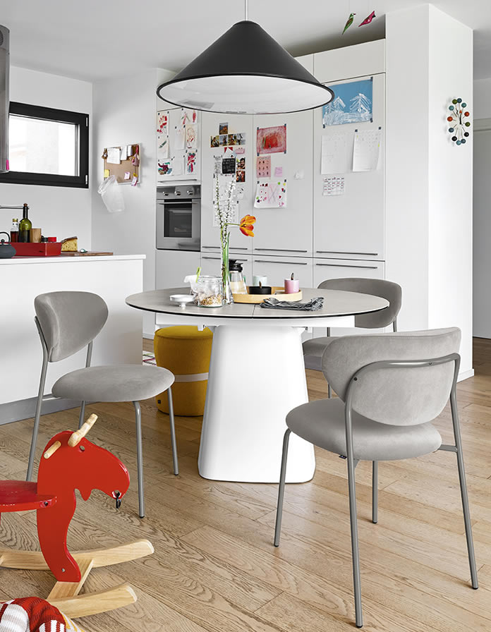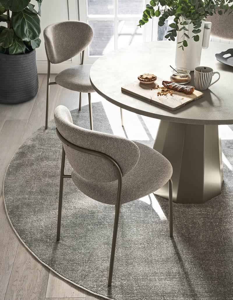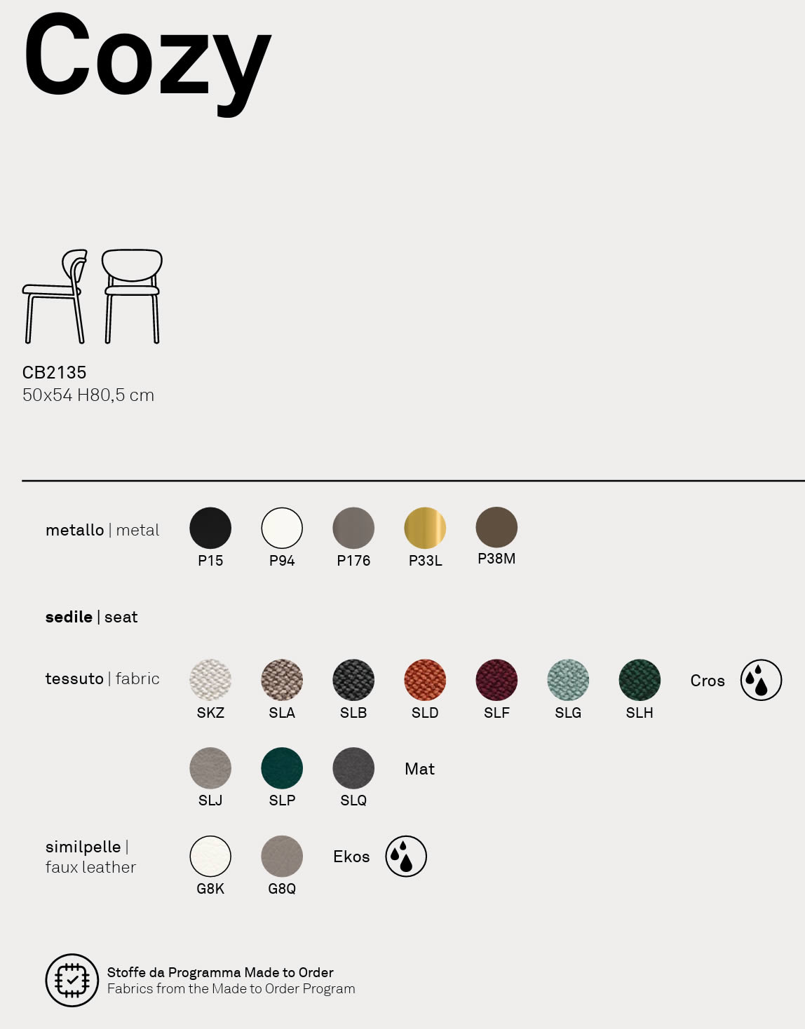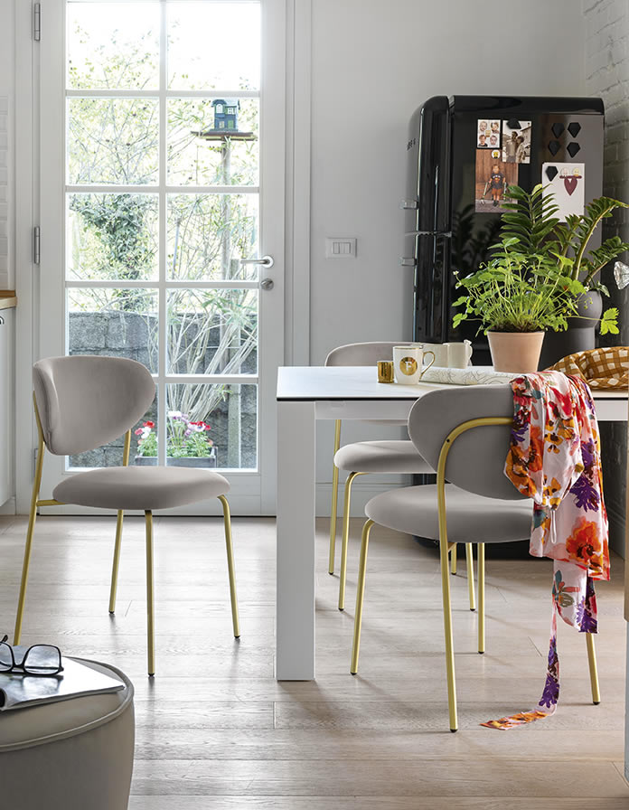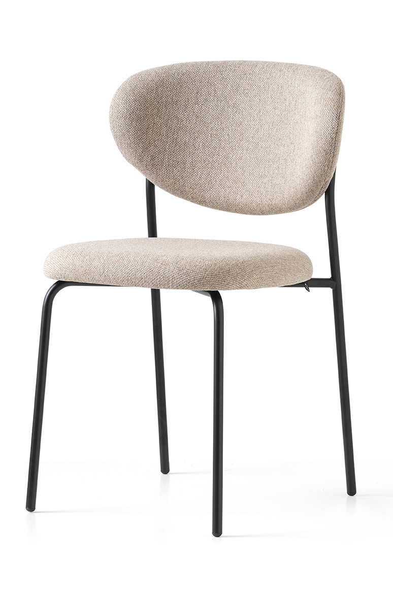 Caratterizzata da un colorato fusto in metallo e da sedile e schienale imbottiti rivestiti in tessuto, la sedia Cozy rappresenta versatilità e leggerezza.