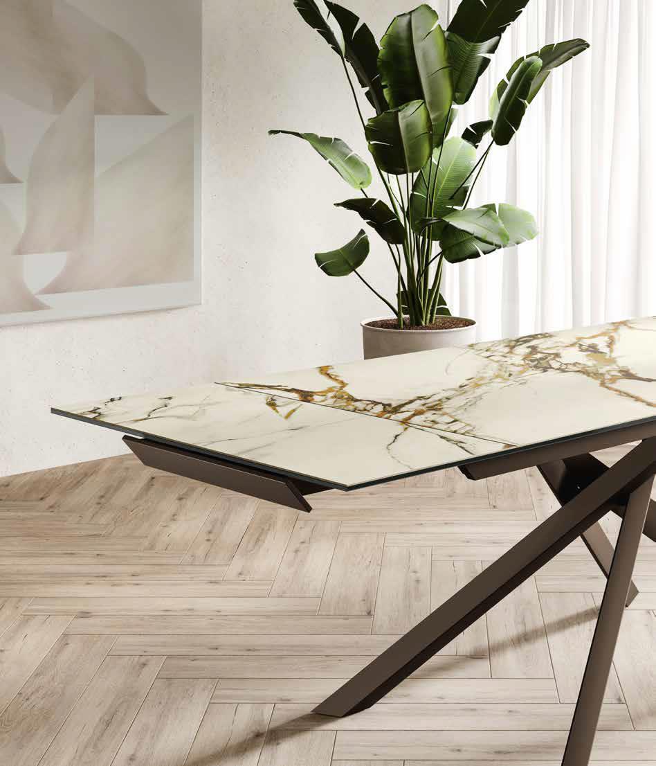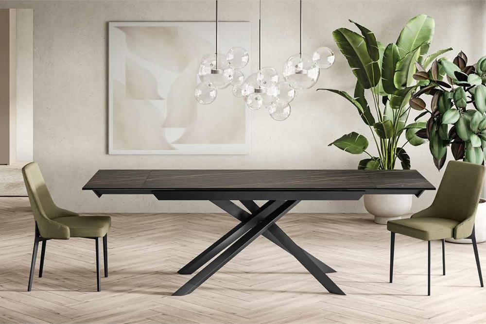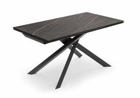 Tavolo allungabile con top in ceramica su vetro. Gambe in metallo verniciato.