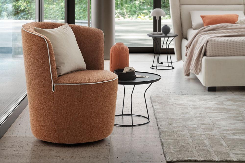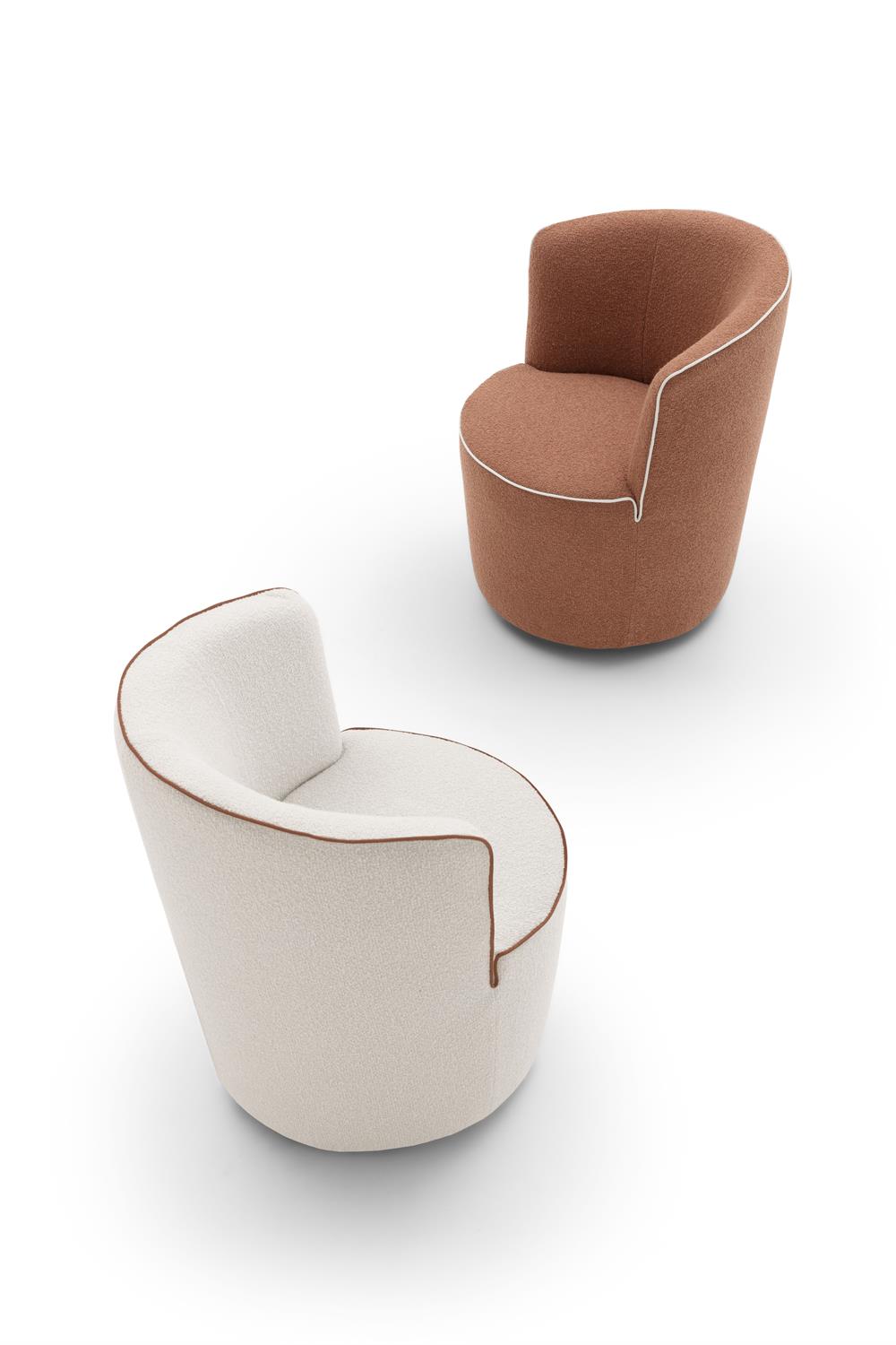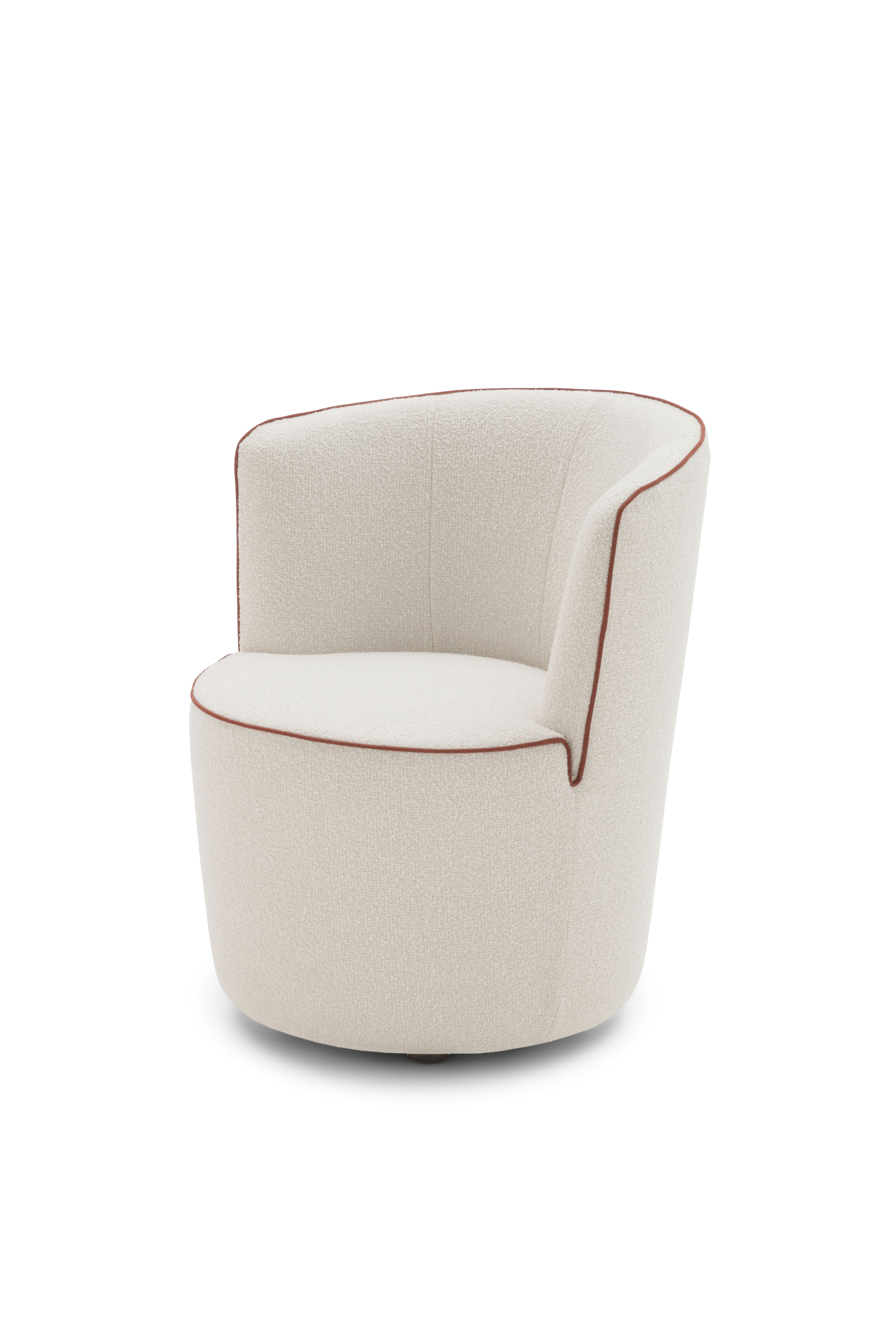 Dafne è una poltroncina dalla silhouette rotonda e accogliente. Le dimensioni rimangono contenute, i volumi sono sinuosi fluidi e la bordatura a contrasto ne esalta lo stile.