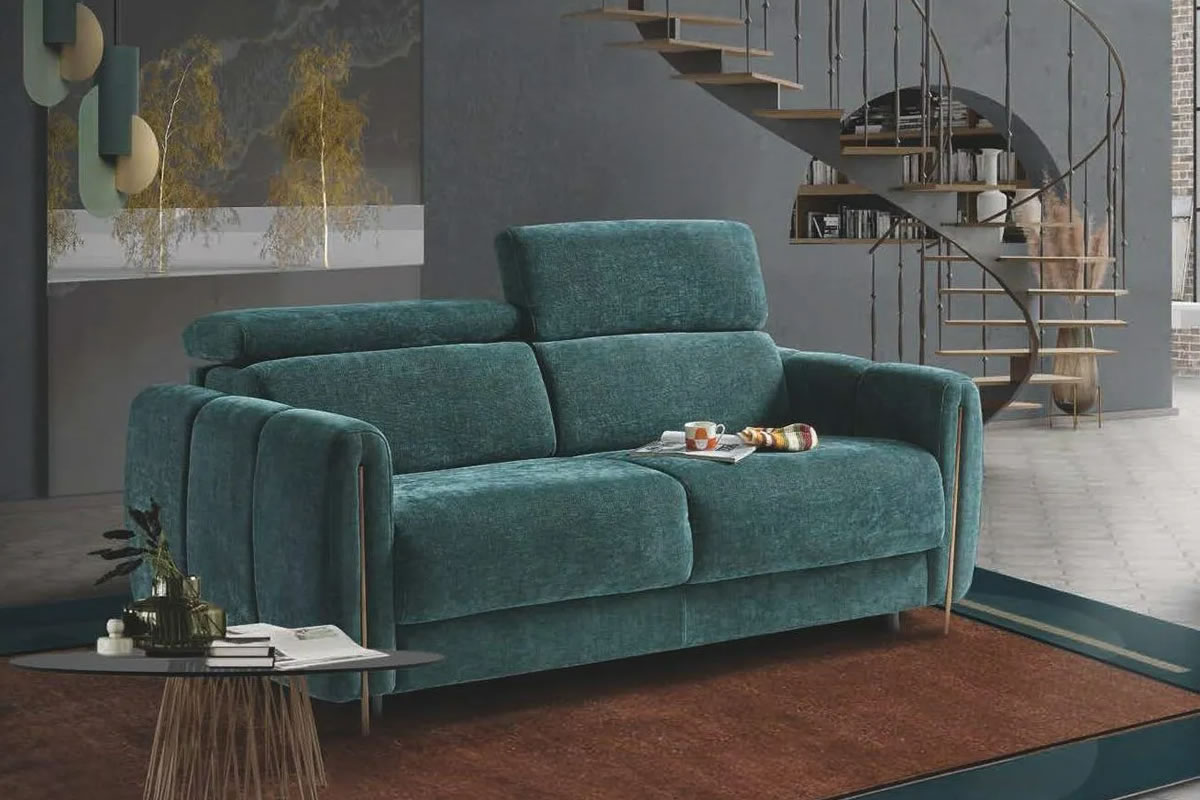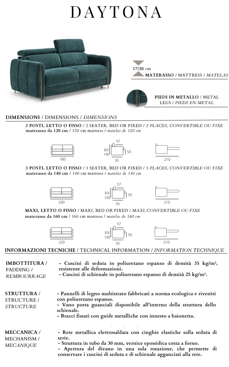 Il divano-letto Daytona è un ode all'eleganza contemporanea, un elemento distintivo per chi cerca un tocco metropolitano nel proprio spazio. le cuciture verticali dei suo braccioli aggiungono un tocco di raffinatezza e originalità e creano un punto focale unico grazie anche ai lussureggianti inserti metallici.