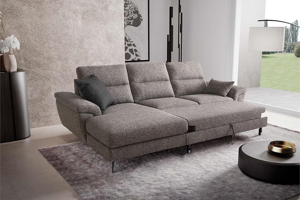 Divano con piano poggiapiedi estraibile, che ti consente di trasformare il tuo divano in un comodo letto, seduta angolare asimmetrica e braccioli arrotondati.