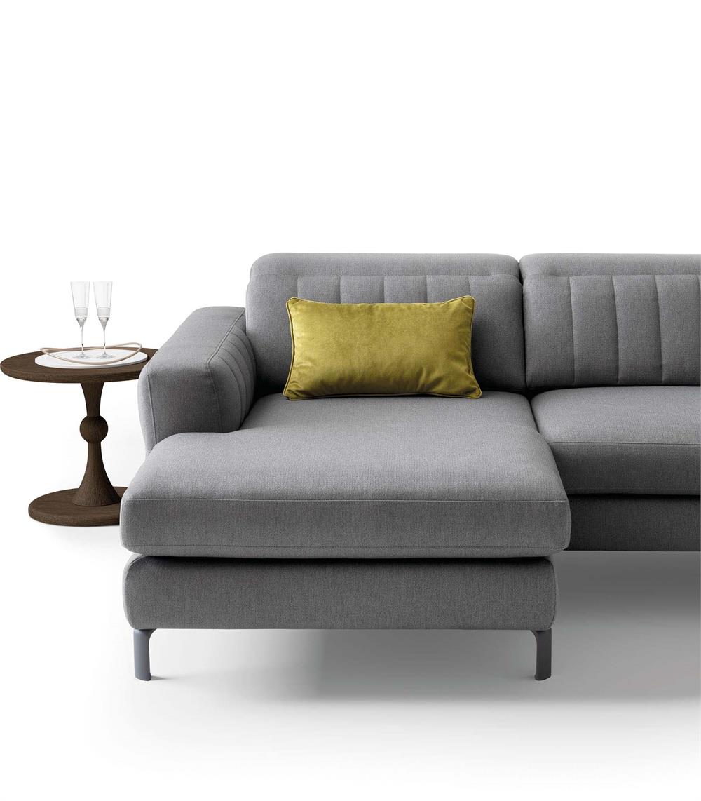 Come gli alti piedini di Egon slanciano e sorreggono una ricca composizione di volumi, così i poggiatesta reclinabili sostengono la parte alta del corpo, coccolandola con gli studiati poggiareni evidenziati dalle cuciture verticali che vivacizzano il rivestimento in tessuto o pelle.