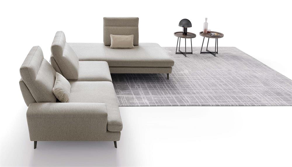 Frontalmente, grazie al particolare meccanismo traslante, gli schienali modificano la profondità delle sedute, per arrivare anche a scomparire sul laterale angolare in forza della loro amovibilità.