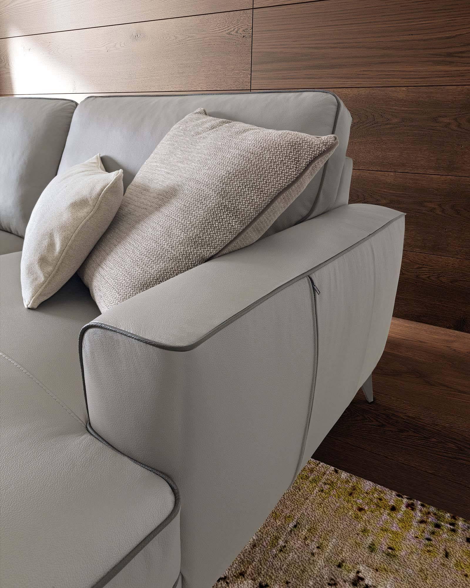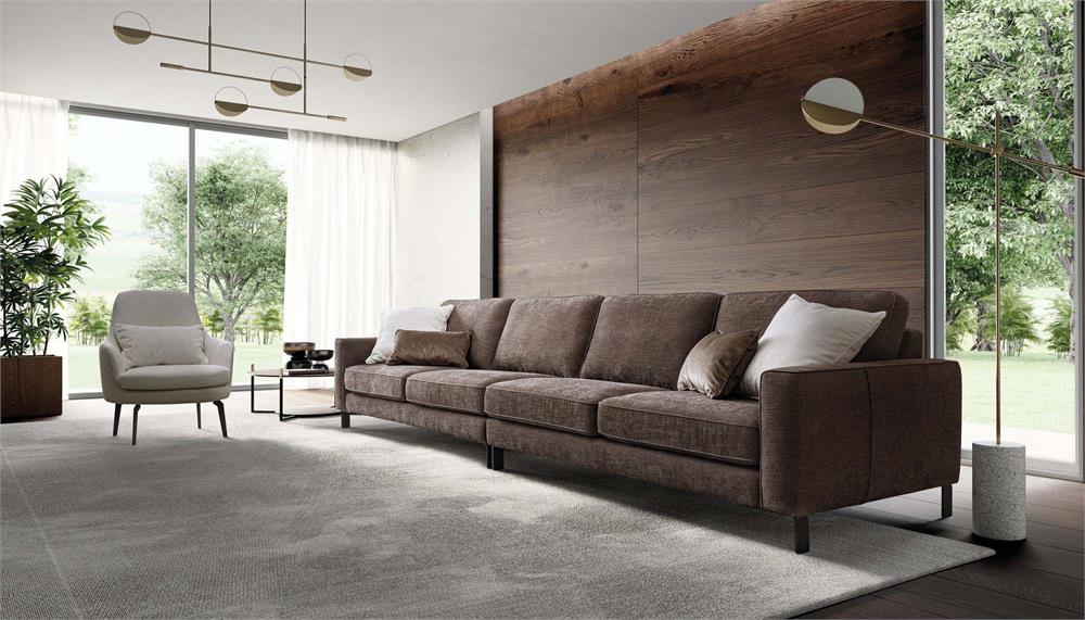 Evidenziare il perimetro del salotto di casa, per farne risaltare profondità e ampiezza, questa è la missione di Russel, divano che fa dello slancio il suo principio compositivo, evidenziato dagli eleganti piedini dal profilo sottile.