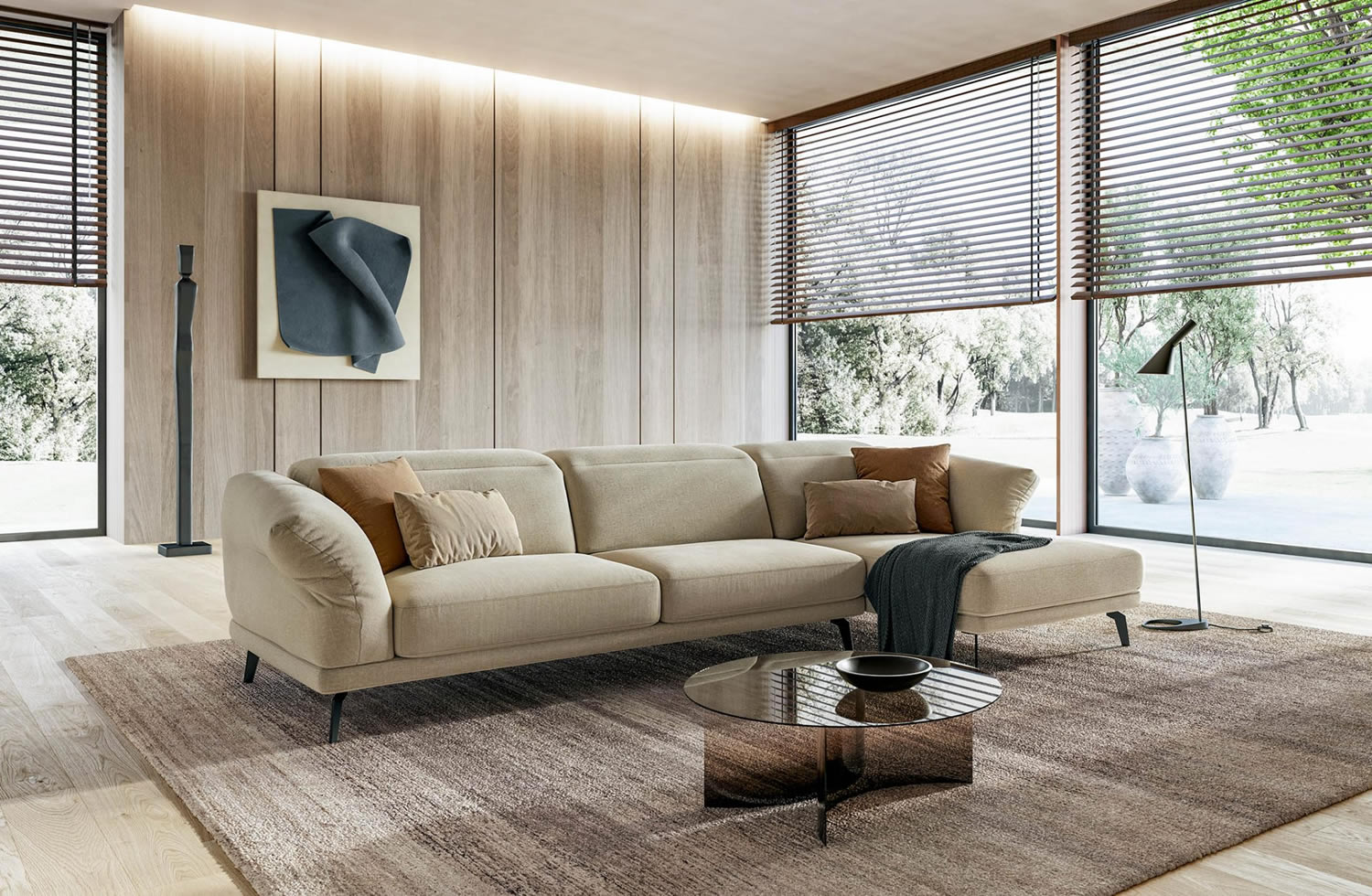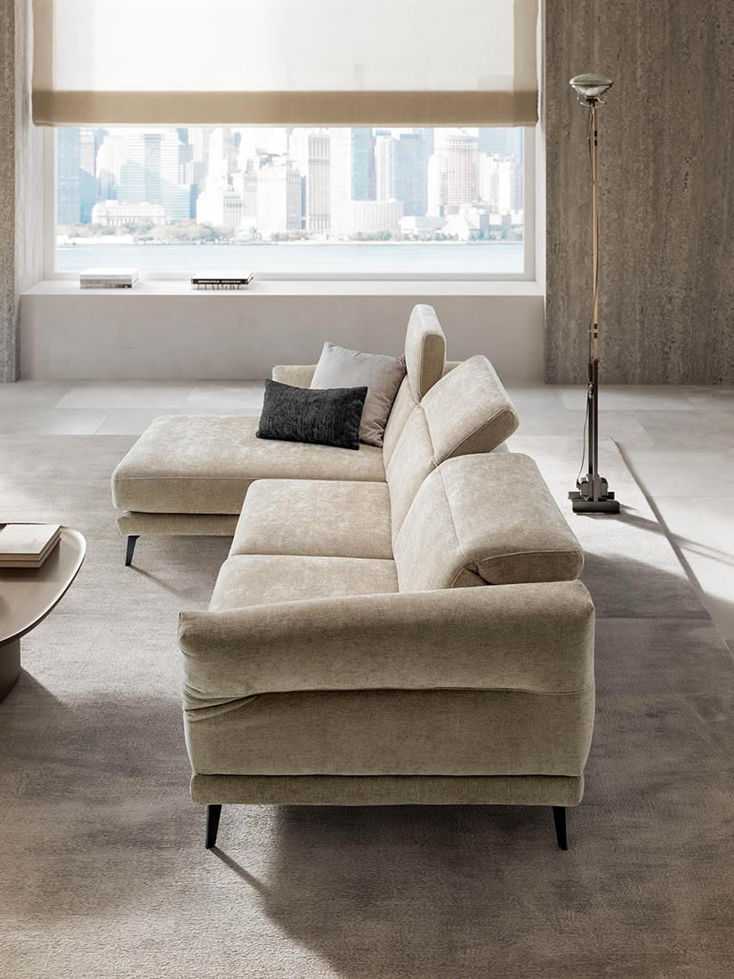 Il comfort è variabile sulle tue esigenze di riposo, grazie alla opzione delle sedute estraibili e ai poggiatesta regolabili in sette posizioni, per calibrare il sostegno del collo. A queste caratteristiche si aggiungono anche i nuovi braccioli pieghevoli, che trasformano Sky in un divano dinamico, che cambia aspetto ad ogni gesto.