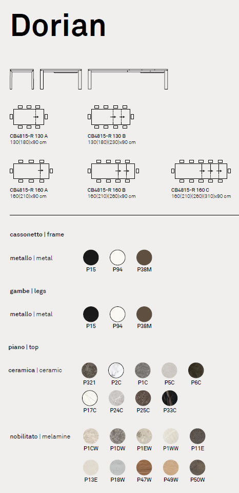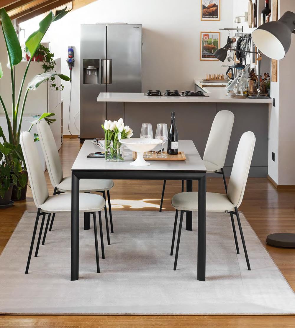 Allungabile con fianchi a sezione arrotondata in metallo verniciato. Ha una allunga interna che si rivela tirando il tavolo dal ponte gambe grazie alle pratiche rotelle nascoste. L'ampiezza delle combinazioni e dimensioni creano un tavolo versatile capace di adattarsi ad ogni esigenza estetica e funzionale.