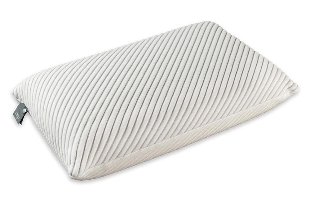 La speciale fodera Duo Clima si adatta perfettamente alla forma del cuscino e può essere girata a seconda della stagione: lato grigio realizzato in tessuto Tencel® Fresh con trattamento termoregolatore HeiQ Smart® Temp, lato bianco in tessuto Tencel®.