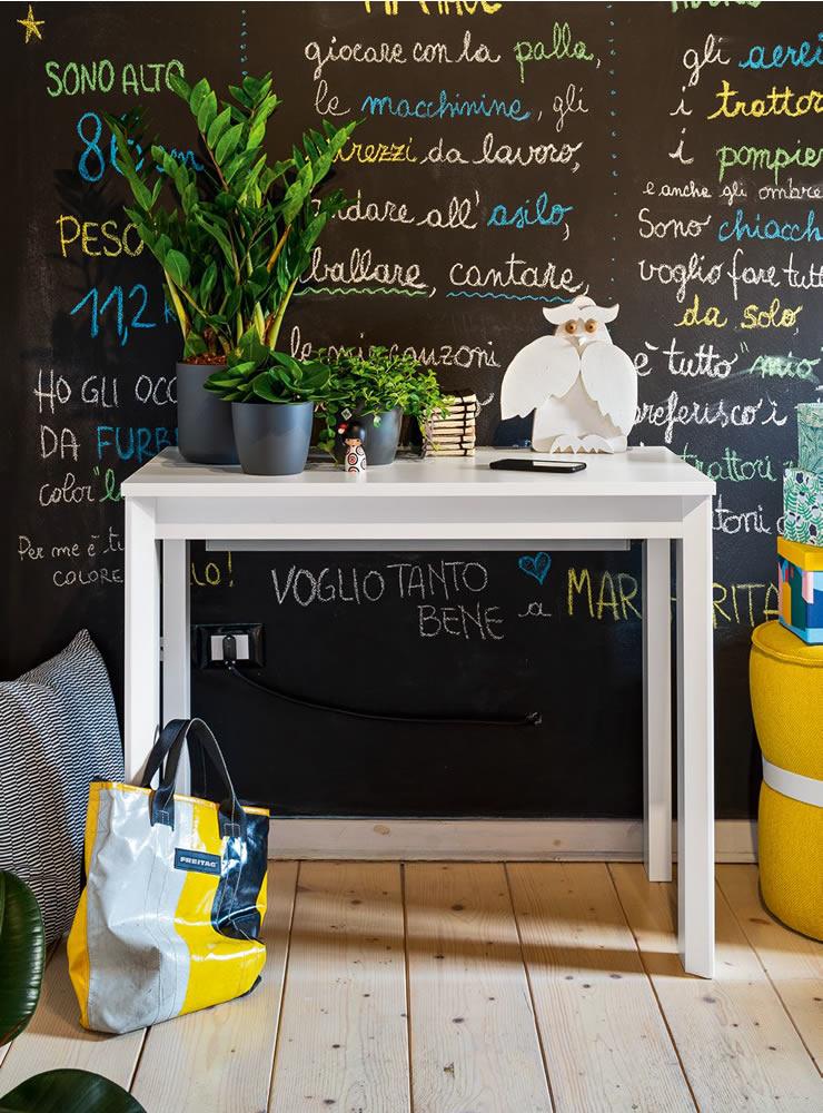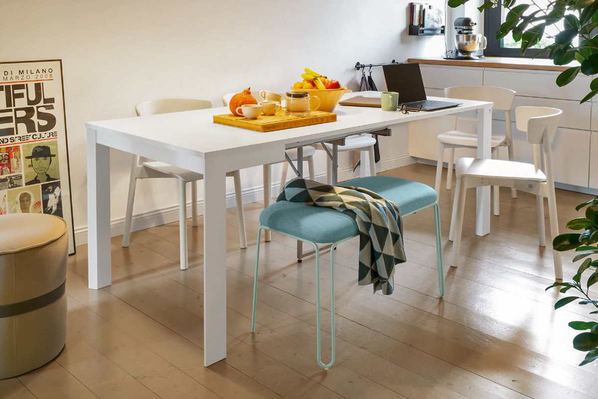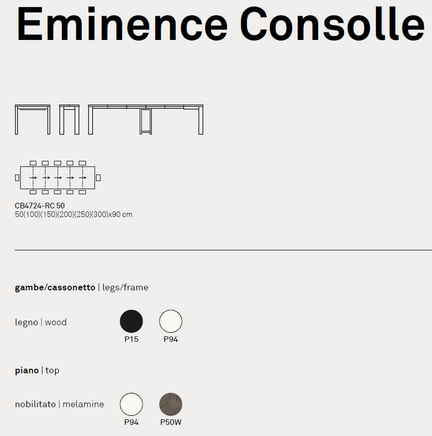 Tavolo consolle modello EMINENCE CONSOLLE. Struttura in metallo e piano in nobilitato. Consolle adattabile alle diverse misure multiple di 50 cm. La stabilità è garantita anche nella massima apertura del piano (300 cm) grazie alla quinta gamba centrale. Le allunghe non utilizzate vengono conservate in un’apposita cartellina di materiale plastico.