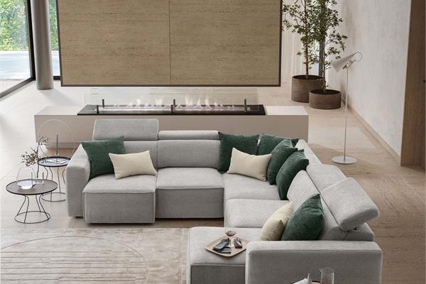 Divano in tessuto angolare con poggiatesta reclinabili.