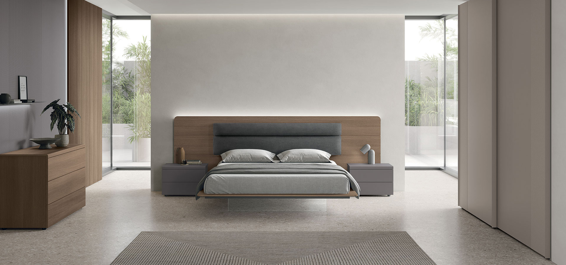 Il letto Leonardo in materico rovere cognac arreda con eleganza l’intera parete.