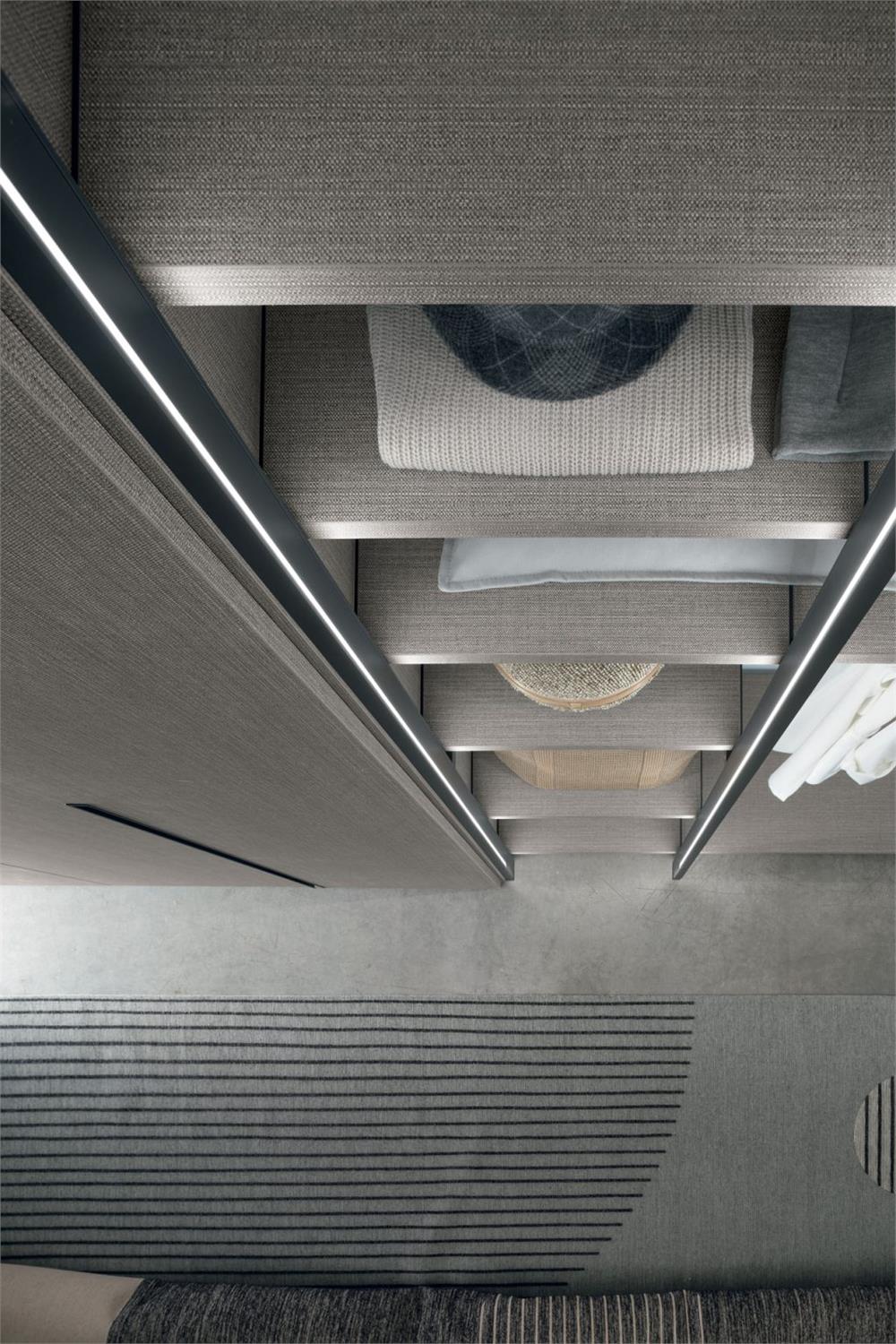 La luce a led opzionale integrata a tutta altezza sui telai e il frontale in vetro dei cassetti alleggeriscono la struttura.