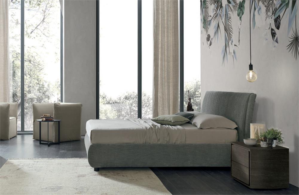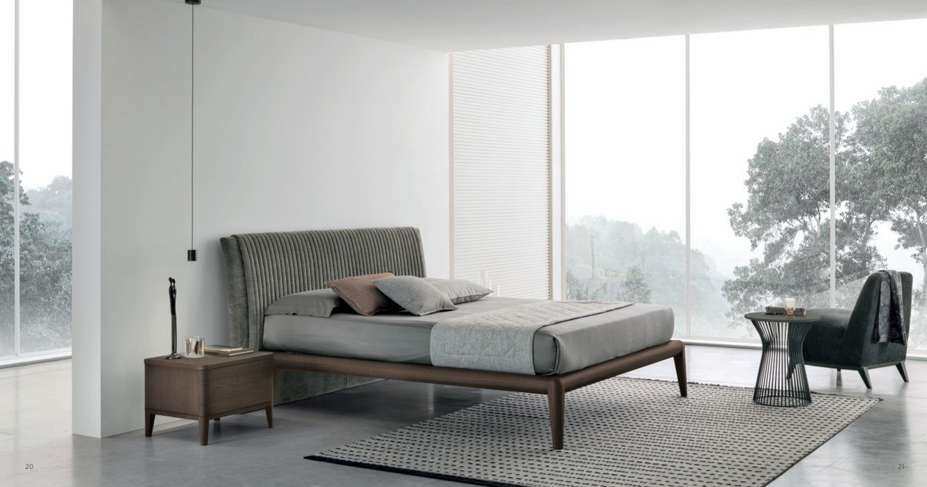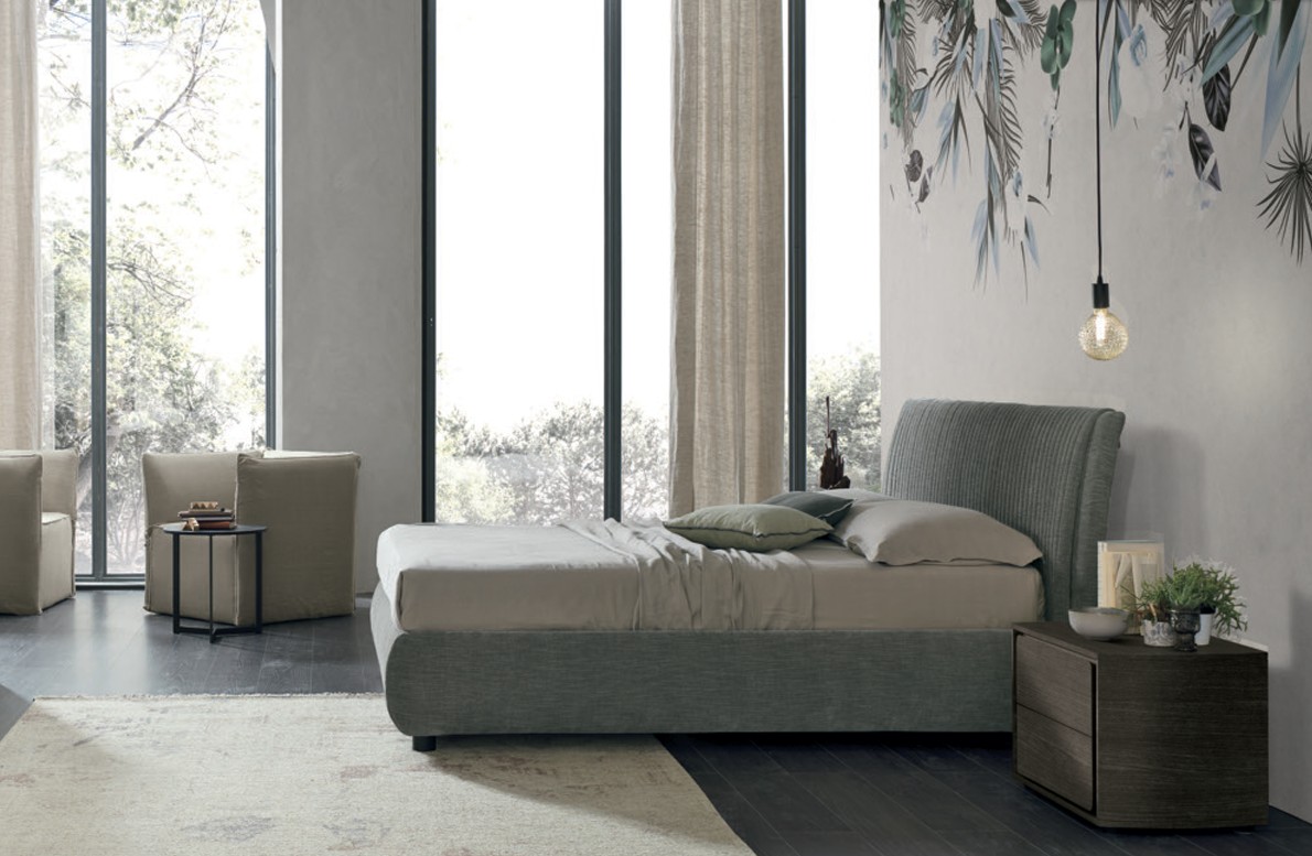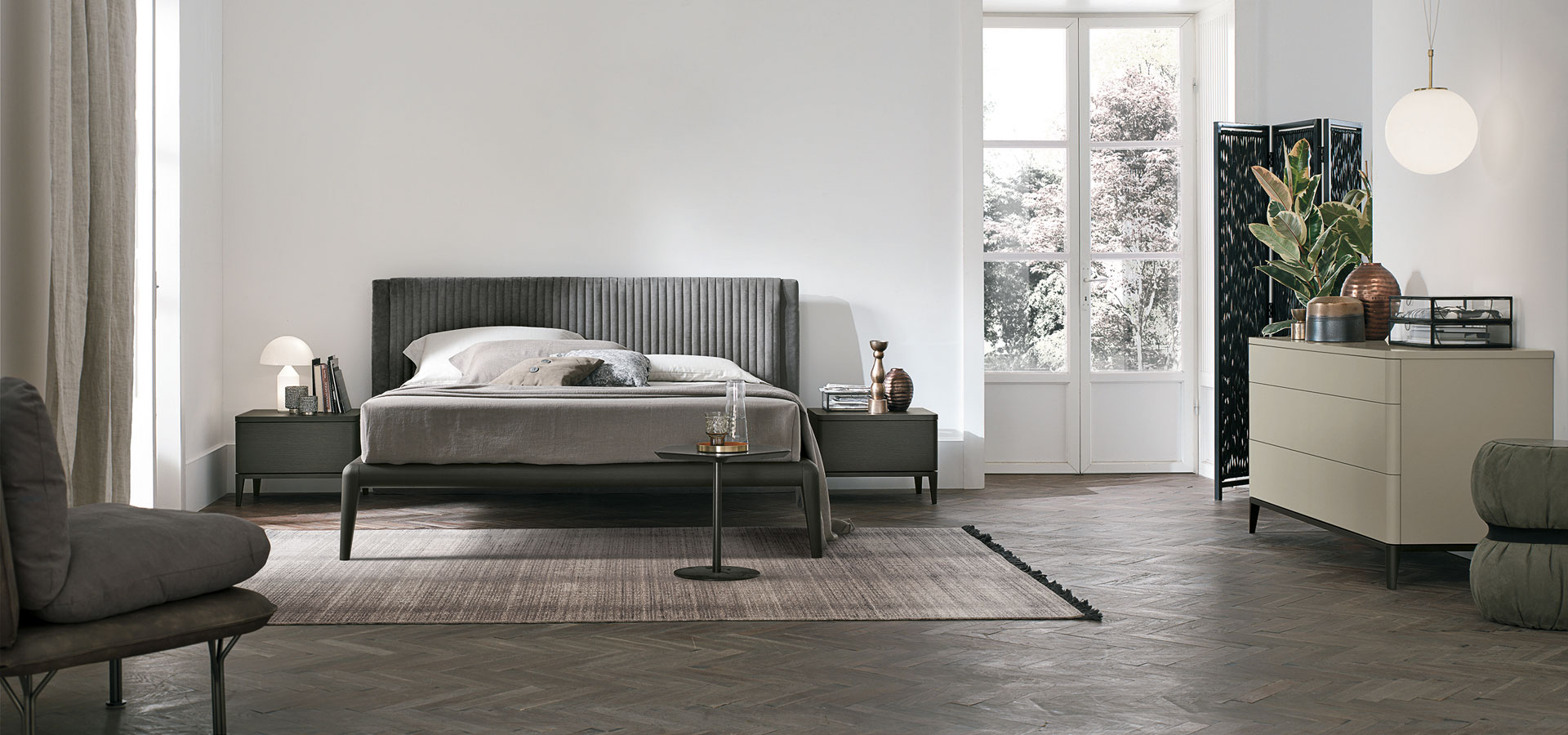 Il giroletto dalle forme arrotondate e la testiera imbottita dalle caratteristiche cuciture verticali arredano una notte dall’atmosfera raffinata.
