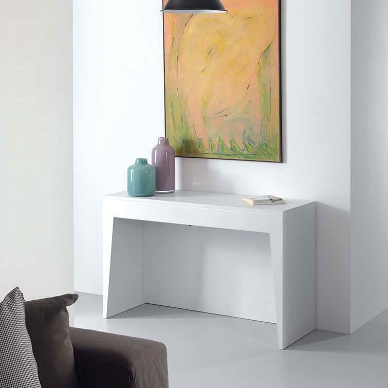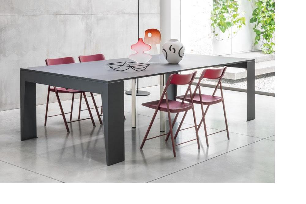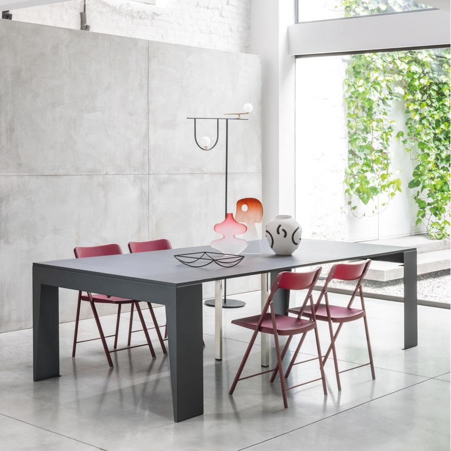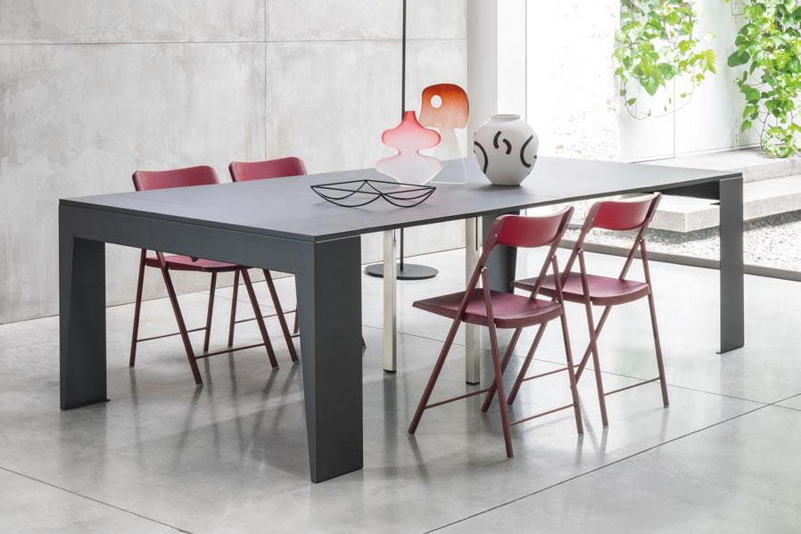 Marvel è la consolle trasformabile in tavolo che contiene le proprie allunghe. Il tavolo viene fornito completo di 4 allunghe (da 60 cm cadauna) che trovano alloggiamento all'interno della struttura e diventano il fondo della consolle integrandosi perfettamente nella stessa. Ha la struttura in lamina d'acciaio verniciato con finitura sablé e il top in laminato ecologico spessore 18 mm. La guida estensibile è in alluminio e le gambe di sostegno pieghevoli sono in acciaio inox.