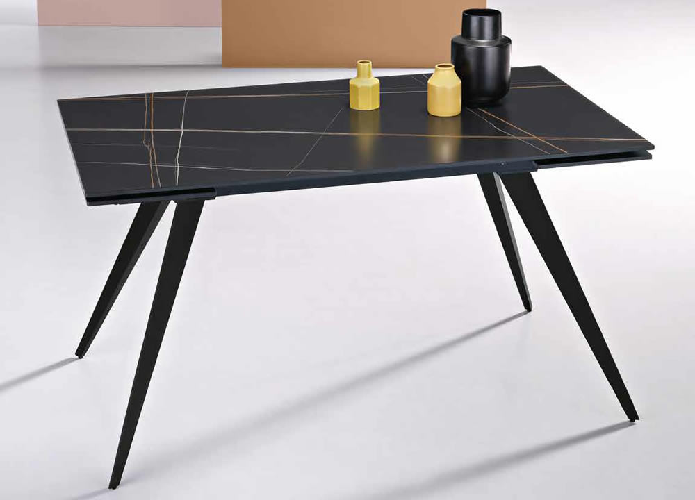 Tavolo con gambe inclinate in metallo verniciato e piano in pietra sinterizzata effetto marmo.