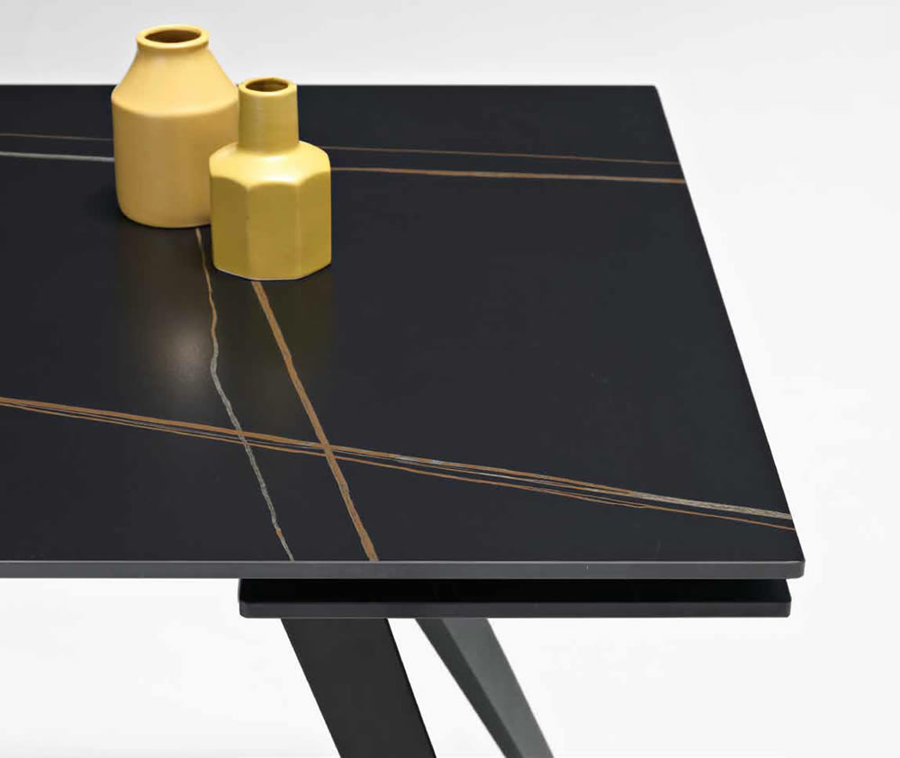 Struttura in metallo Nero. Piano in pietra sinterizzata Marmo Nero opaco.