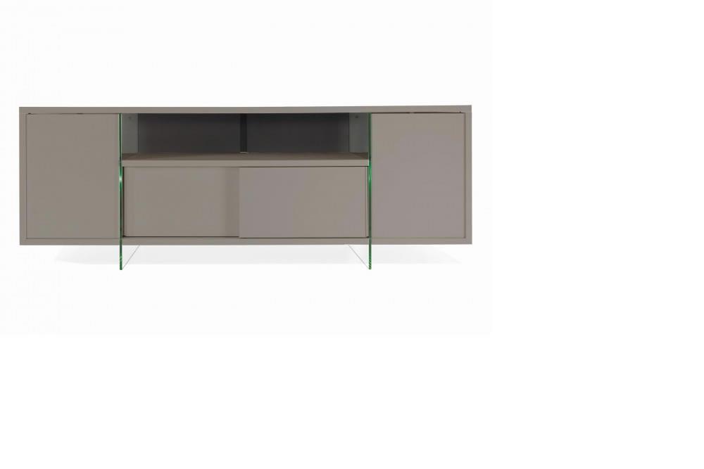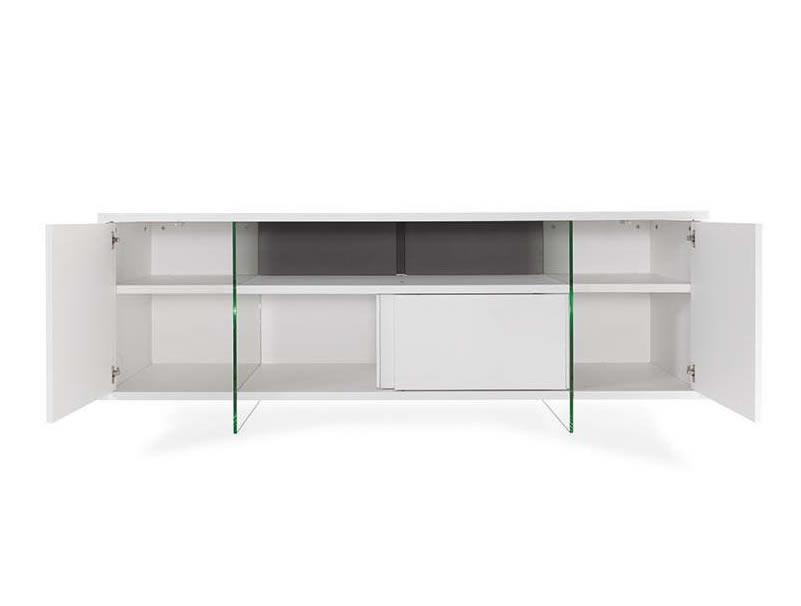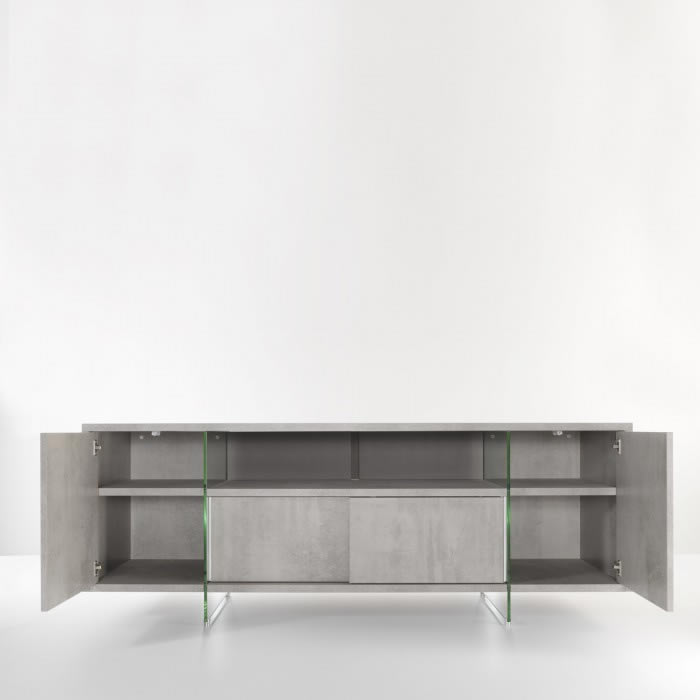 Gli originali montanti interni in vetro consentono di vedere in trasparenza all'interno dei contenitori laterali e sollevano il mobile da terra in modo leggero e originale. Le ante centrali scorrono appese al binario del ripiano superiore, mentre le ante laterali si aprono mediante push-pull.