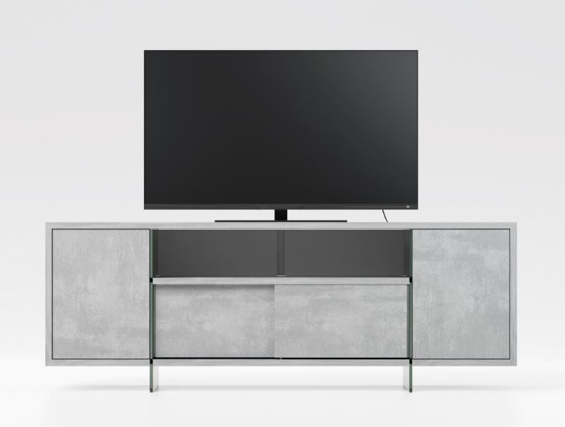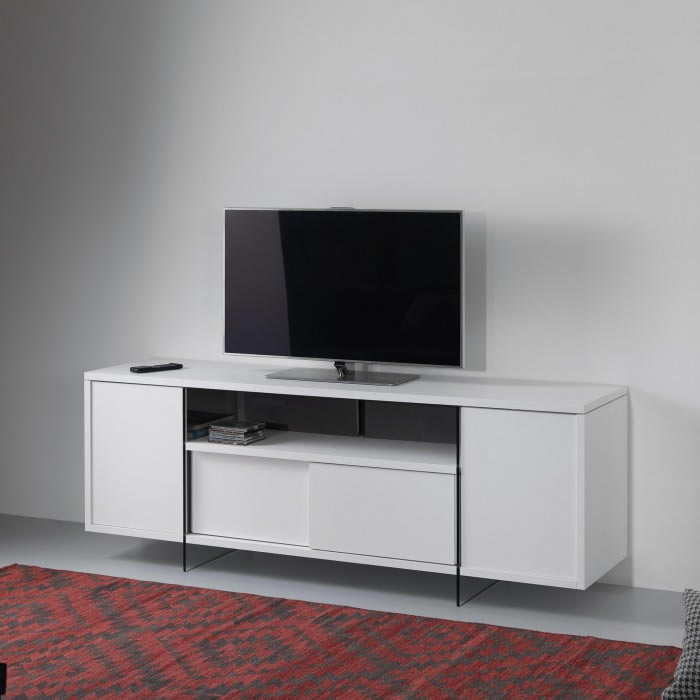 Questo mobile Tv dal design lineare ha un ripiano a giorno che, sul fondo, ha due pannelli mobili predisposti per coprire ed alloggiare i cablaggi delle apparecchiature elettroniche collegabili alla Tv.