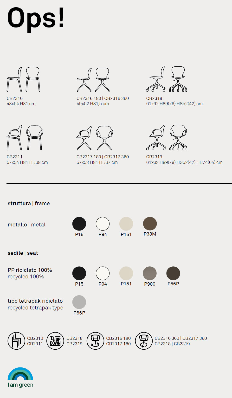 Oltre all’innovativa versione in tetrapak riciclato con finitura color sabbia, Ops! è disponibile anche in polipropilene 100% riciclato in innumerevoli varianti di colore. Per conoscere le varianti, visiona l'immagine in calce.