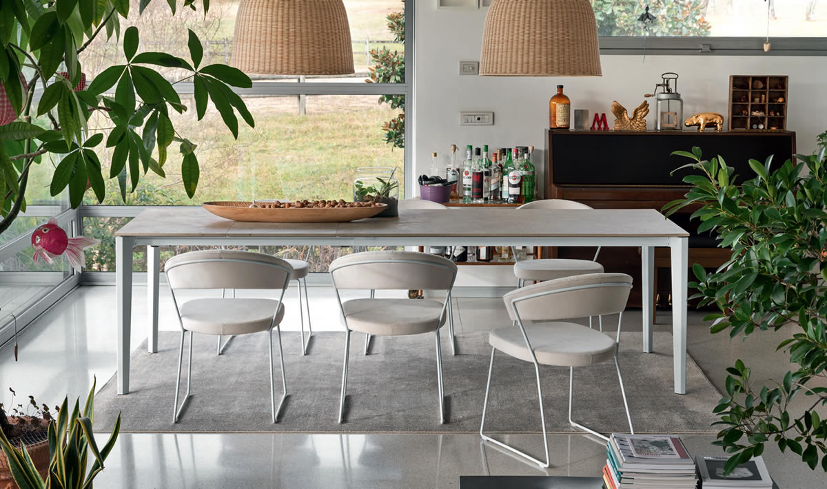 Tavolo con piano in nobilitato L. 130 con 2 allunghe, gambe perimetrali