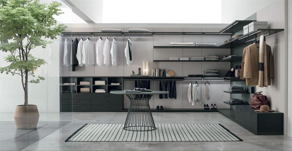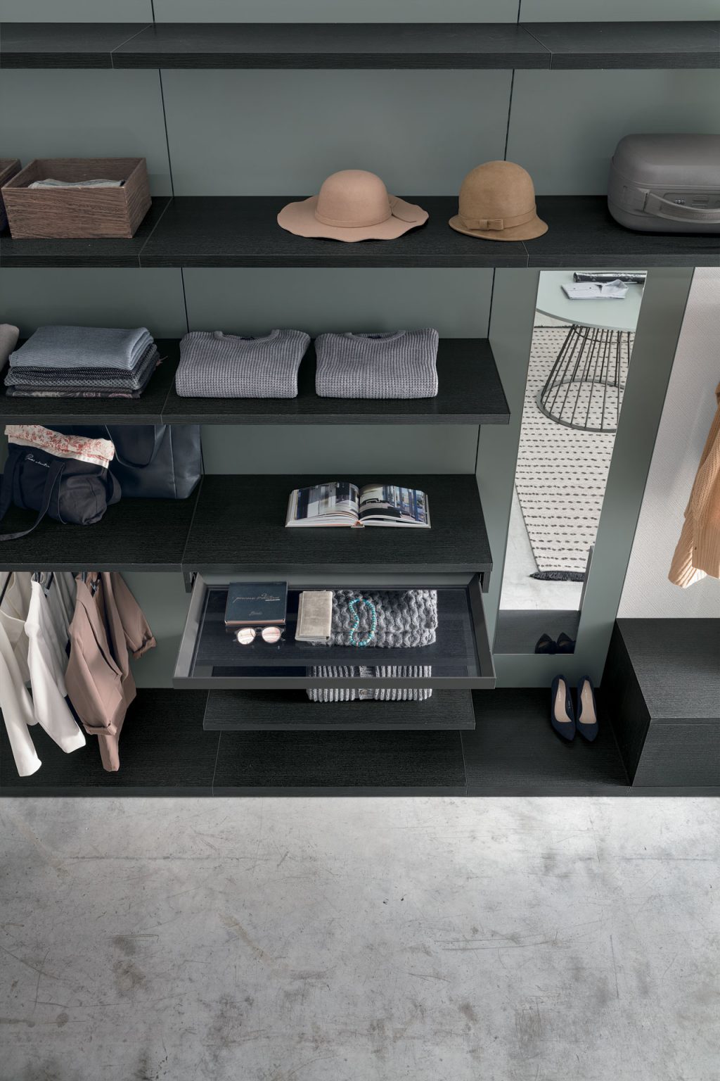 Pratico è una cabina armadio composta da boiserie personalizzabili in diverse finiture o grafiche stampate, sulle quali vengono posizionate, a seconda delle esigenze personali, diverse soluzioni di attrezzature: cassettiere sospese o a terra, ripiani con Led o accessori estraibili.