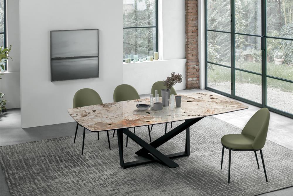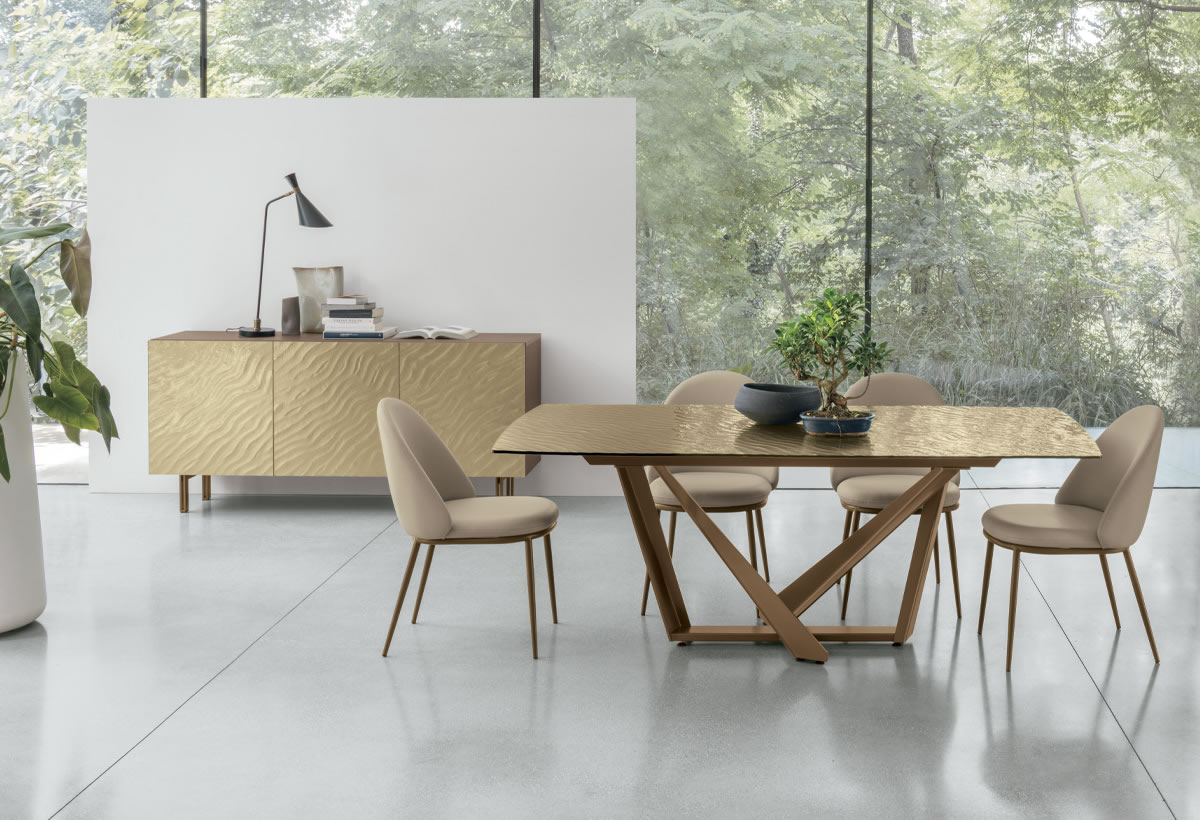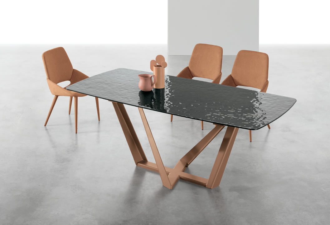 Il basamento di Priamo è un incrocio di direttrici dal forte impatto scultoreo, su cui poggia il piano, fisso o allungabile, dando la possibilità di aggiungere posti a tavola. Un tavolo che coniuga design e praticità.