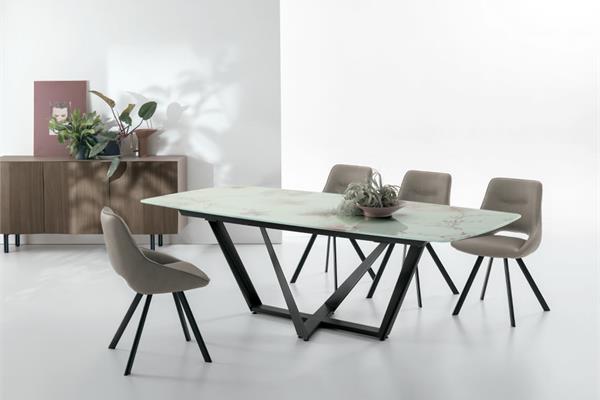 Il piano del tavolo allungabile Priamo è disponibile in gres porcellanato oppure fisso in legno, vetro e vetro ondulato in tante finiture e dimensioni (da 160 a 240 cm).