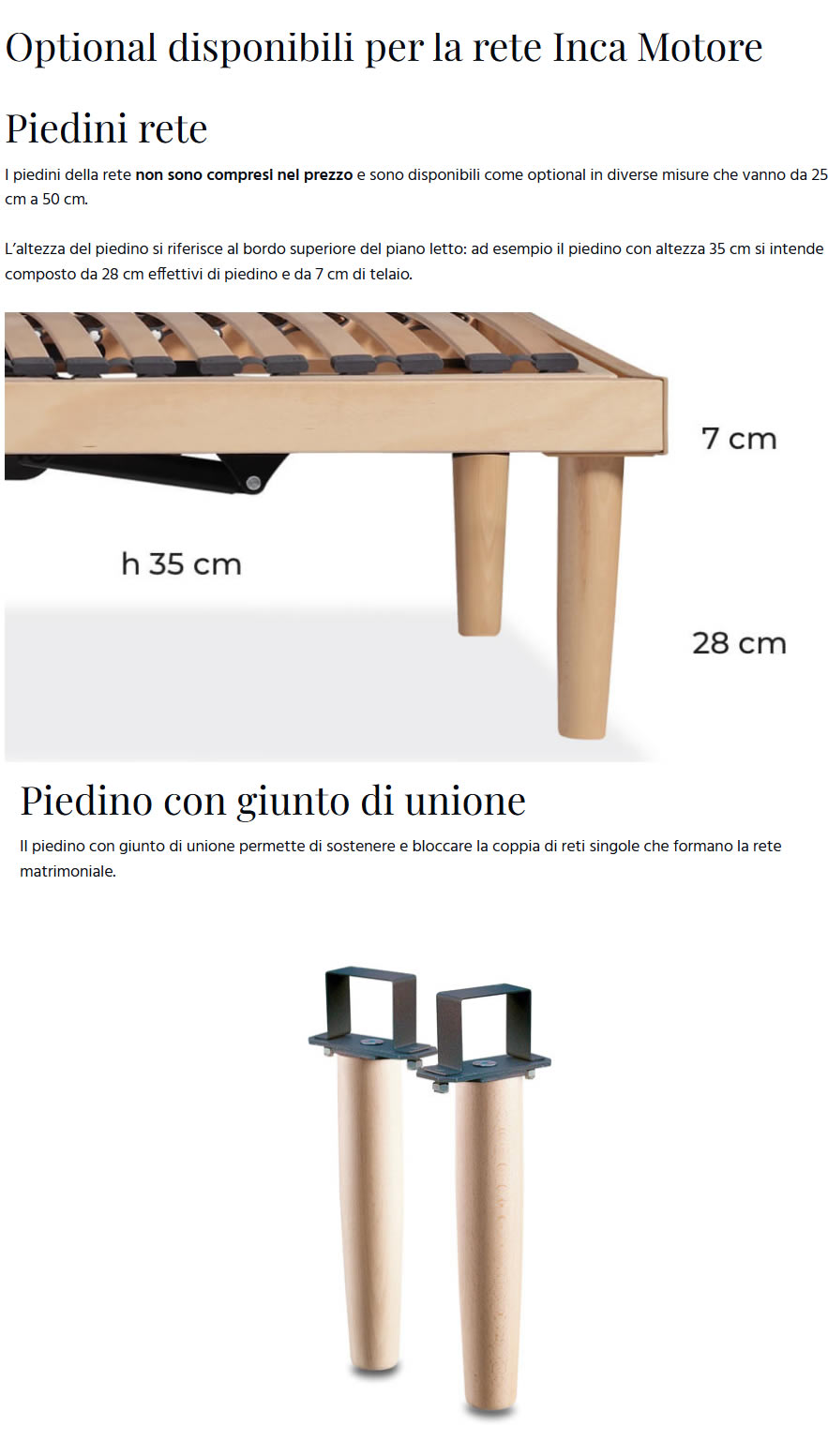 L’altezza del piedino si riferisce al bordo superiore del piano letto: ad esempio il piedino con altezza 35 cm si intende composto da 28 cm effettivi di piedino e da 7 cm di telaio.