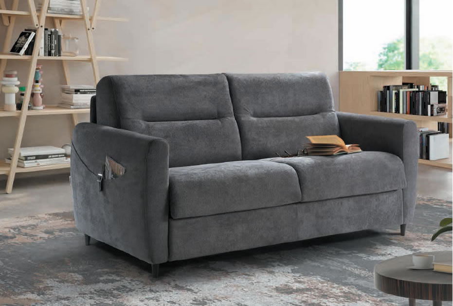 Il divano-letto Roger è un modello dalle linee vivaci, arricchito dalle impunture sullo schienale e dalle cinghie decorative sui braccioli che lo rendono un comodo vano porta oggetti.