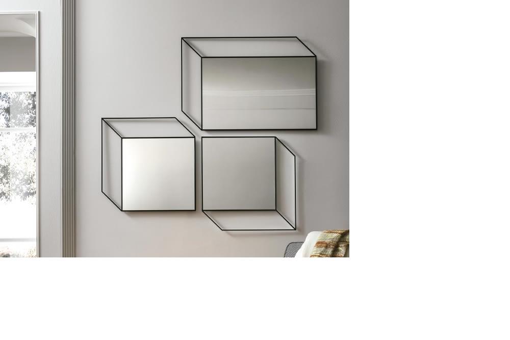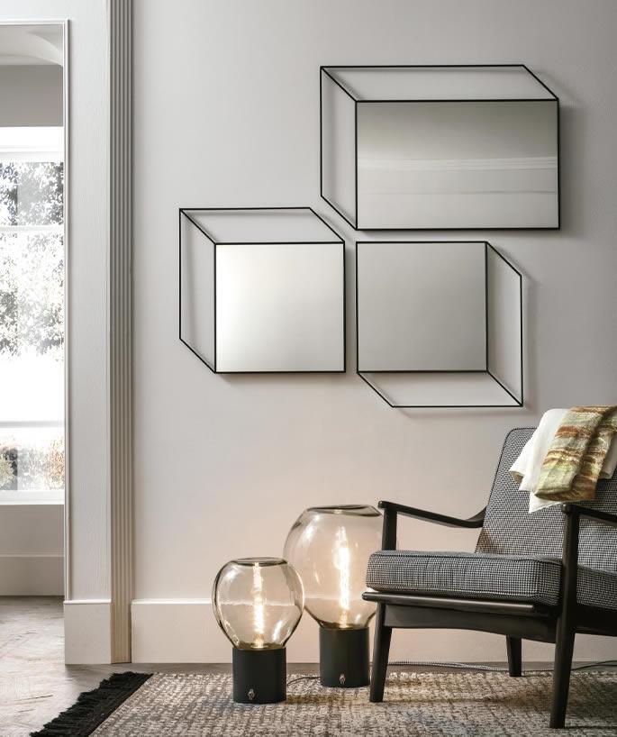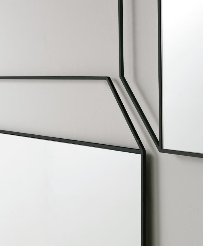 La geometria solida ispira specchiere dalle linee precise: le forme di un cubo e di un parallelepipedo sembrano disegnate sulla parete con un tratto nero e deciso.