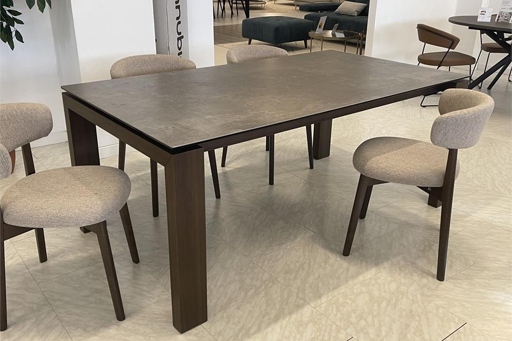 Tavolo allungabile SIGMA: struttura e gambe perimetrali in legno impiallacciato SMOKE, piano rettangolare e allunga in ceramica PIOMBO. Il tavolo SIGMA racchiude al suo interno un ingegnoso meccanismo in grado di ampliare la superficie d'appoggio. Tirando verso di sé la struttura, le due gambe dotate di ruote nascoste scorrono da un lato permettendo di estrarre l'allunga. Con un semplice movimento a rotazione l'allunga montata su binari in metallo esce dal suo alloggiamento e si allinea al piano. Le gambe a sezione rettangolare restano sempre perimetrali garantendo il massimo confort a tutti i commensali.