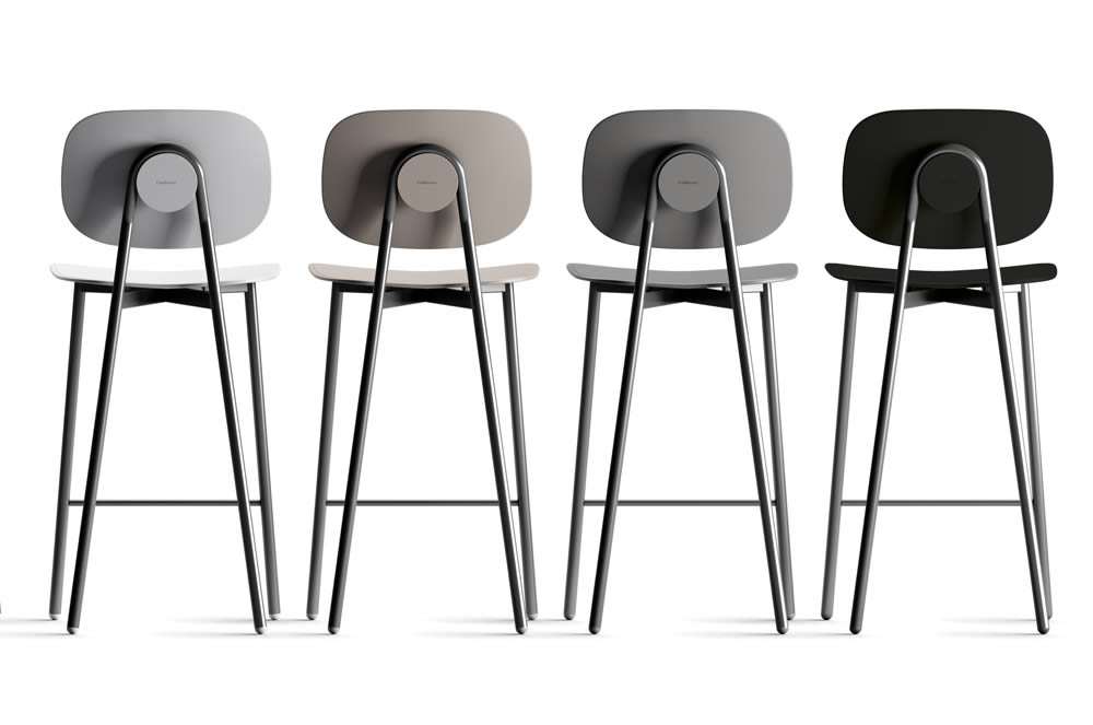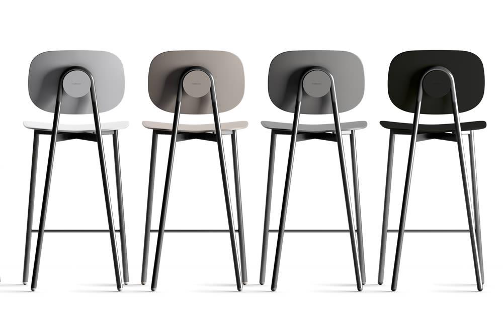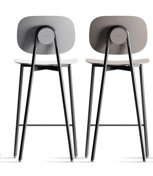 Struttura in tubolare tondo verniciato a polveri epossidiche. Copertura del fissaggio schienale in tecnopolimero, abbinato ai piedini. Seduta e schienale disponibili in polipropilene rinforzato in fibra di vetro, in multistrato nobilitato melamminico o rivestito in tessuto di diversi colori e trame.