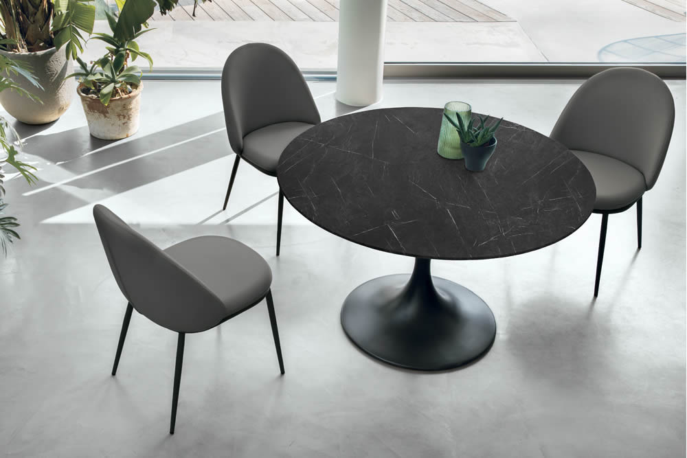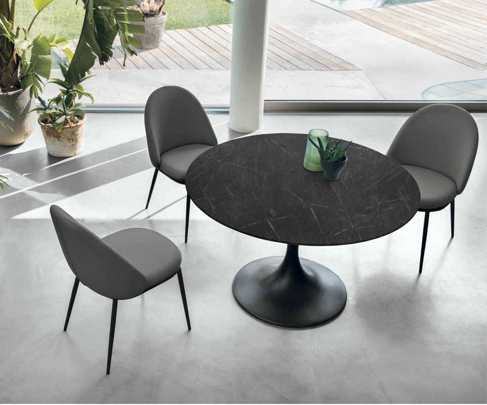 Jazz è l’essenza del design raffinato: un tavolo rotondo che coniuga stile essenziale e dettagli ricercati. Il basamento centrale in metallo verniciato, dal profilo scultoreo che richiama la forma di una tromba, sostiene un piano effetto marmo dalle linee pulite e senza tempo.