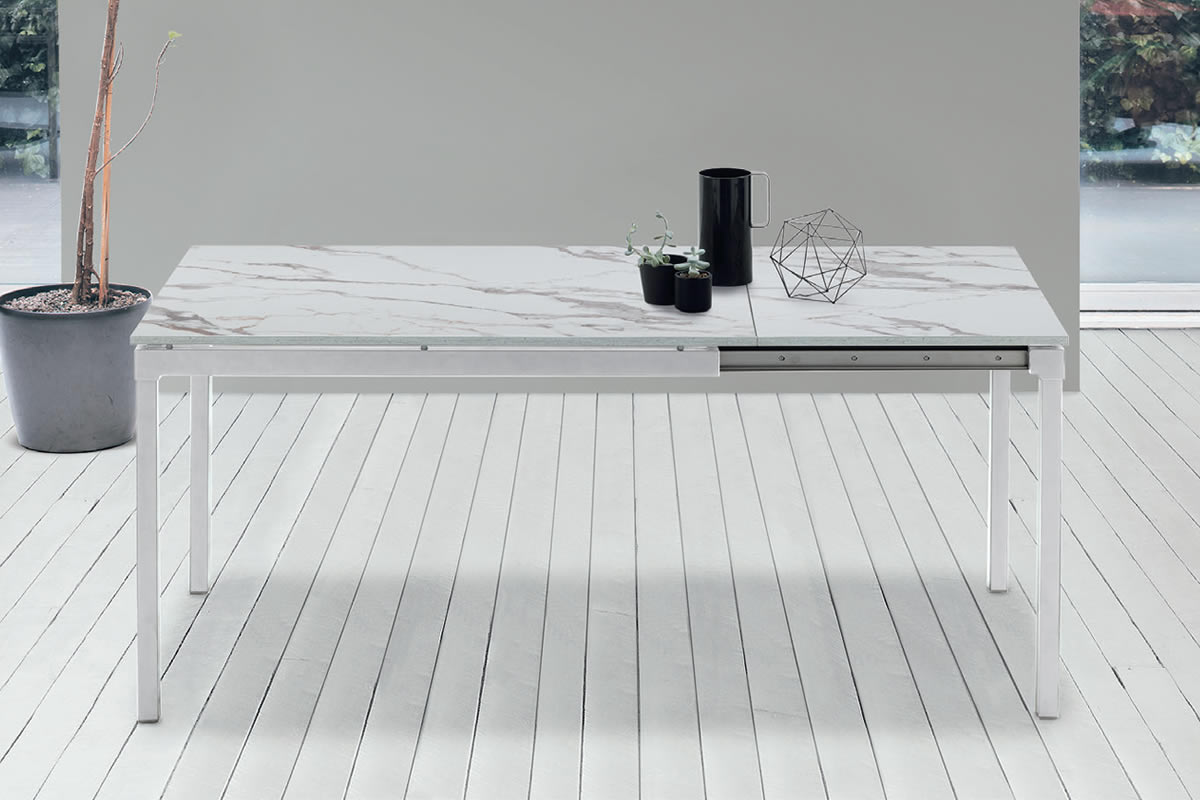 Tavolo allungabile con struttura in metallo verniciato.Piano e allunga laterale in laminato o melaminico.
