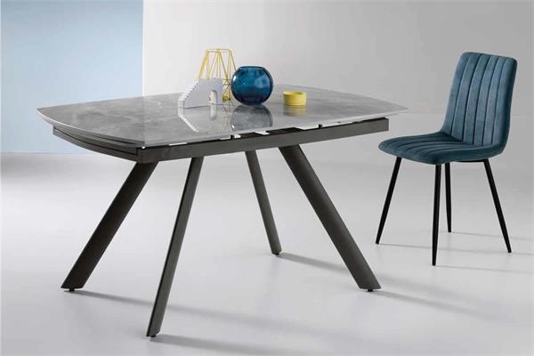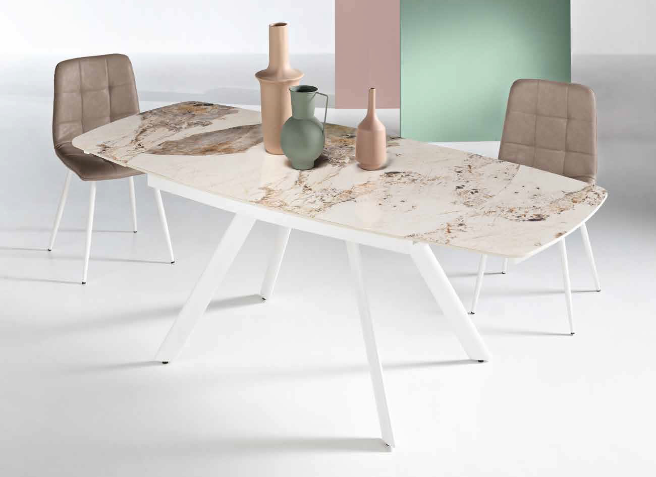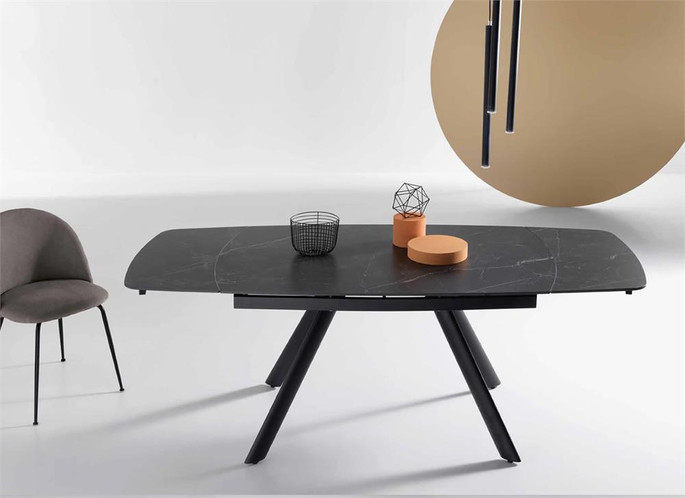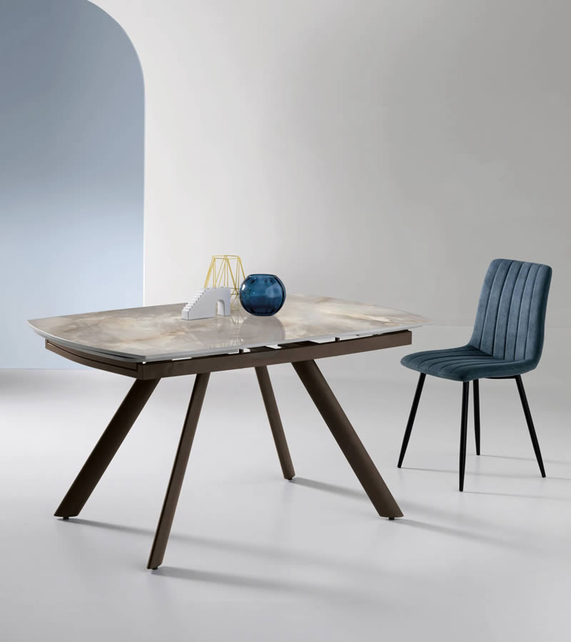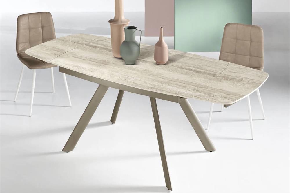 Tavolo allungabile con due allunghe da 35 cm.Base in metallo verniciato e piano in pietra sinterizzata effetto marmo.