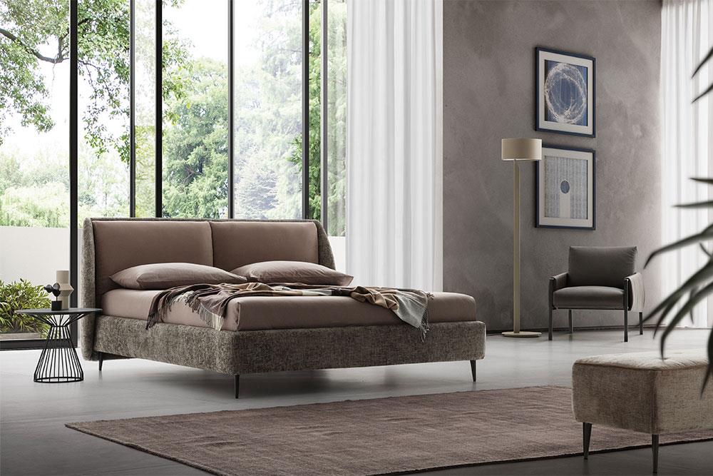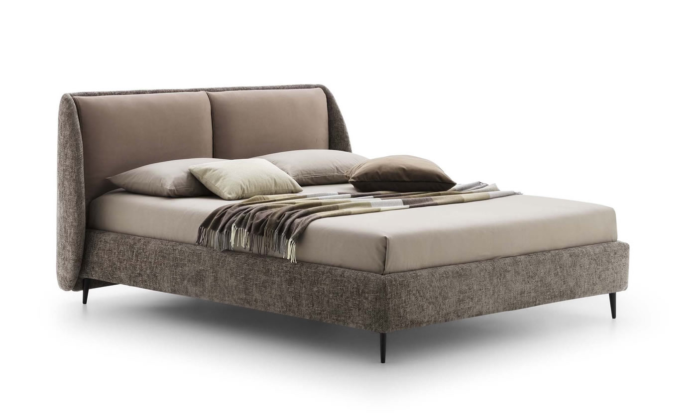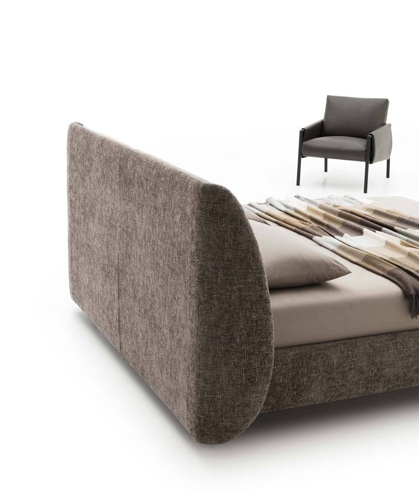 Letto con struttura imbottita completamente sfoderabile. Ali laterali avvolgenti e curvilinee.