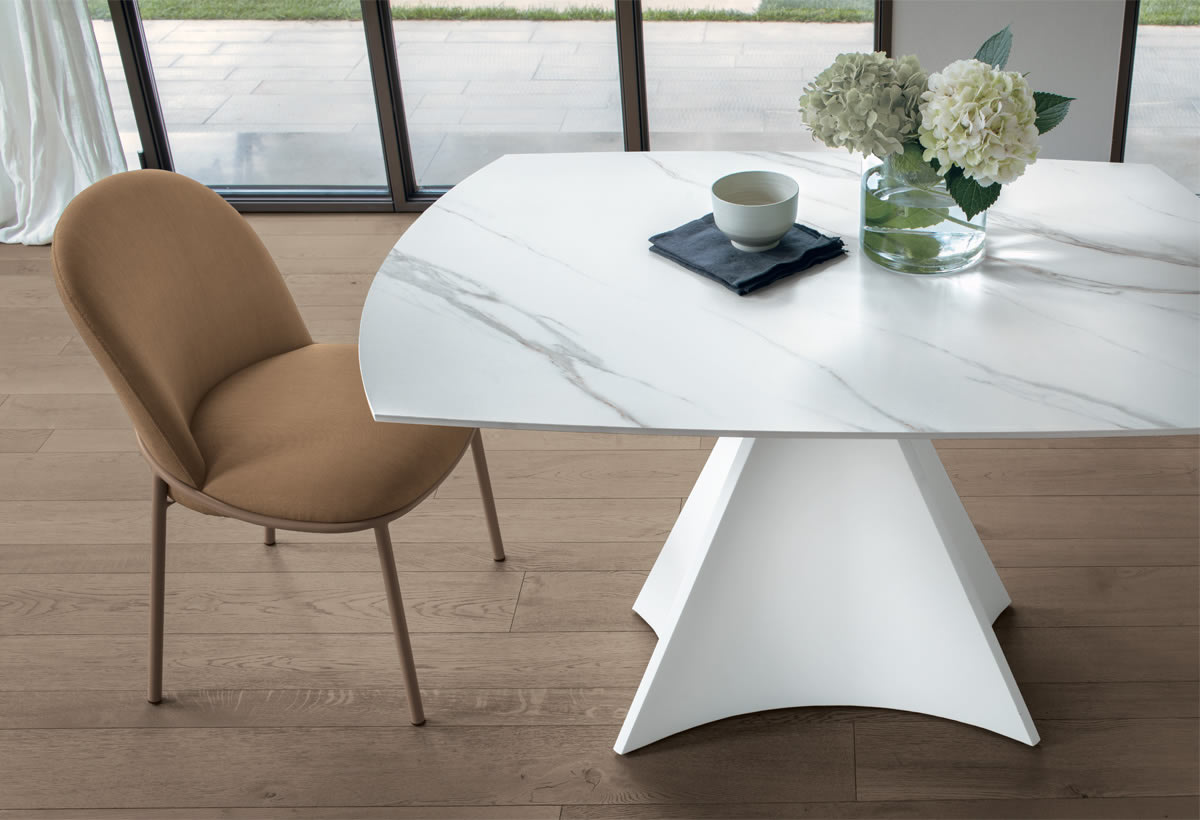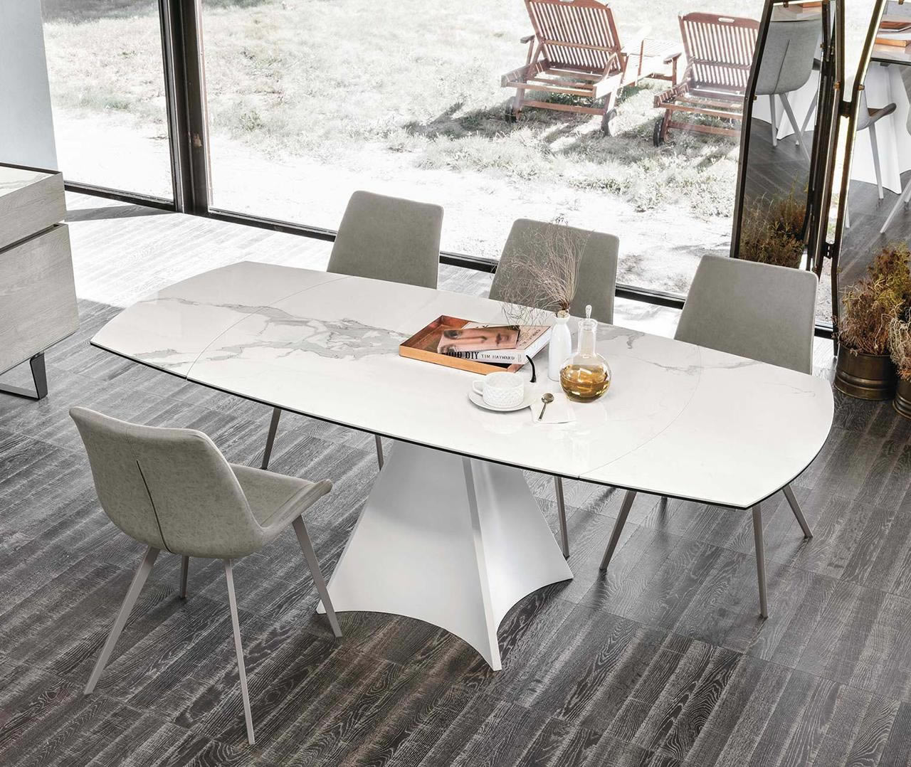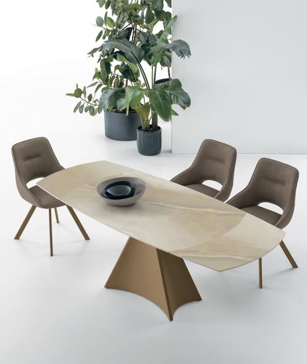Un semplice gesto permette di allungare il tavolo Tornado, con un’imponente base centrale. Il piano a botticella in gres gira sulla base in metallo facendo uscire automaticamente le allunghe laterali. Un sistema intuitivo e veloce, che permette di coniugare estetica e funzionalità.
