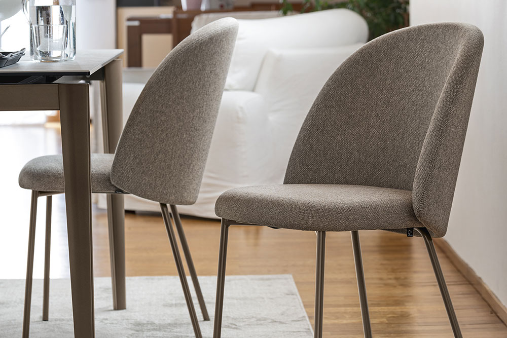 La sedia Tuka è caratterizzata da una struttura in metallo e una scocca imbottita, tappezzata con schienale avvolgente e sedile arrotondato.
