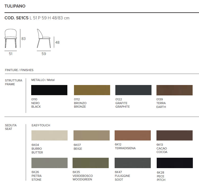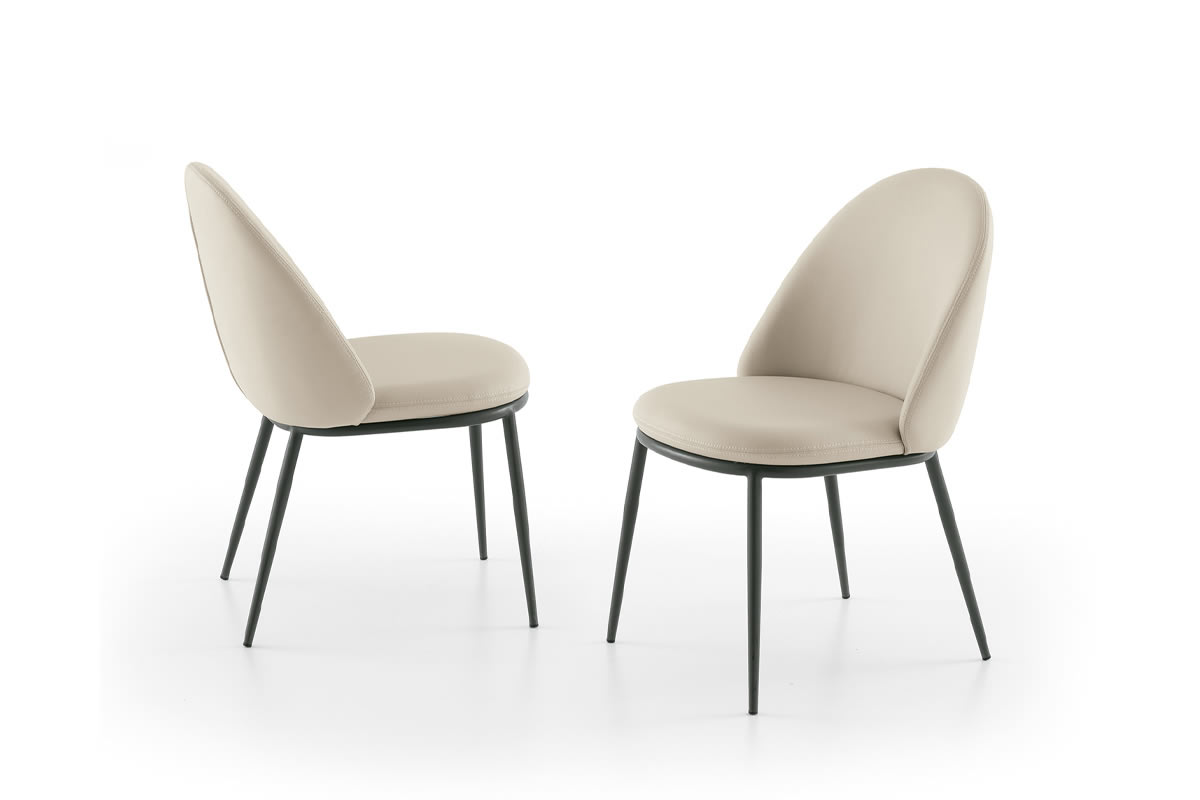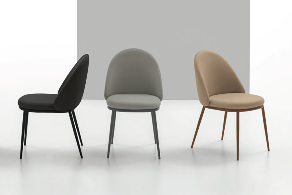 Sedia con struttura in metallo verniciato e seduta e schienale imbottiti. Disponibile con rivestimento in morbido tessuto Easy-Touch effetto pelle oppure nel nuovo tessuto Mellow Blend, soffice e resistente, che esalta il comfort della seduta.