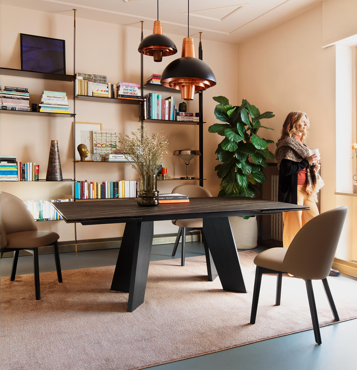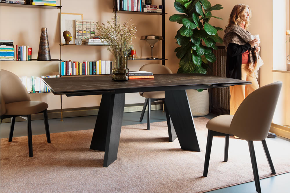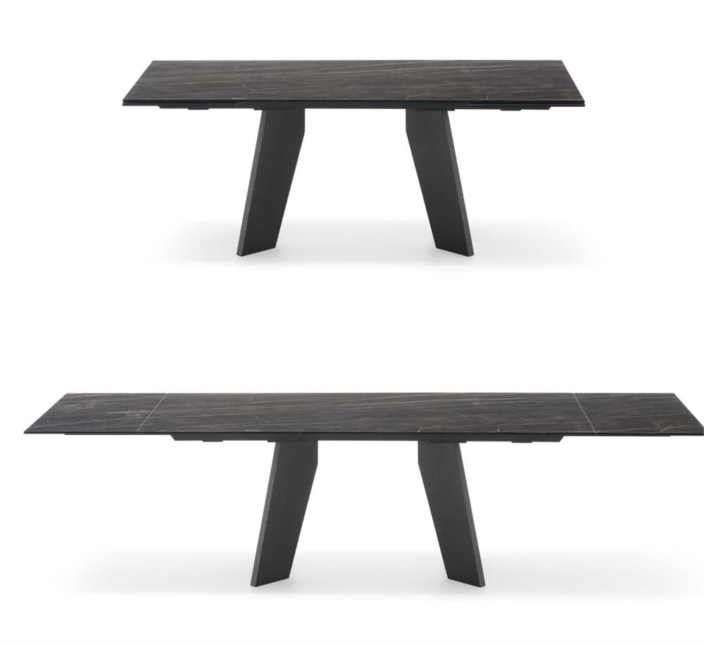 Il tavolo Victor si distingue per il suo basamento caratterizzato da due cavalletti in legno di frassino tinto, che creano un segno grafico distintivo e conferiscono dinamismo e slancio visivo all'intero design. Il piano in ceramica, raffinato e resistente, si integra armoniosamente con la base, esaltando il contrasto tra i materiali. L'equilibrio tra solidità e leggerezza rende questo tavolo un elemento di grande impatto estetico, capace di arricchire qualsiasi ambiente con la sua eleganza.